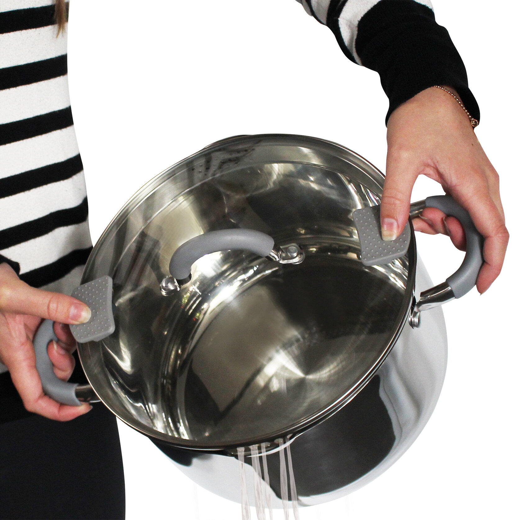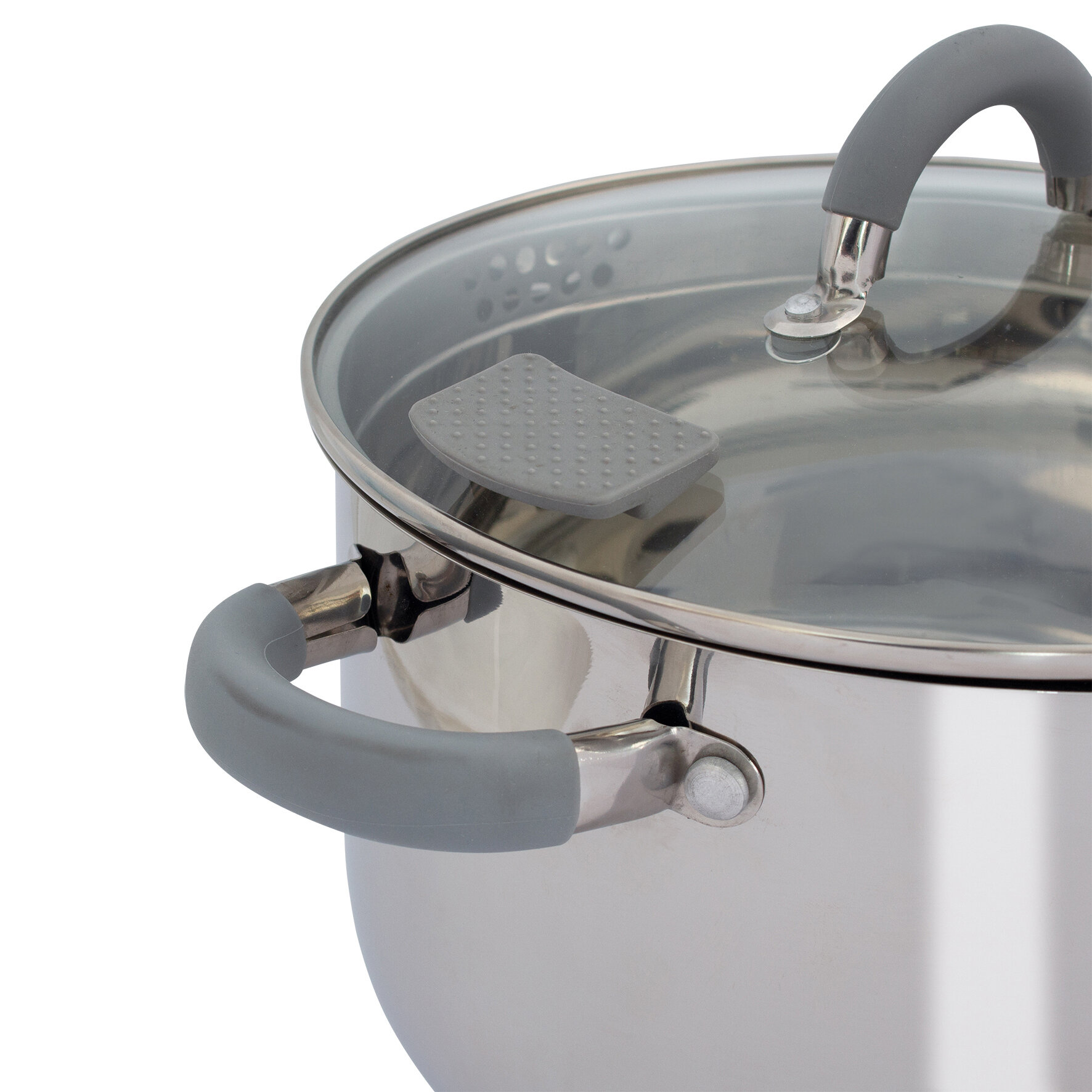 Kochtöpfe Gerona mit Glasdeckel. Die Deckel haben spezielle Silikon-Daumenstützen und eine Öffnung, die das Abgießen erleichtert. Die Griffe sind mit hitzebeständigem, schützendem Silikon versehen. Der Boden ist ein spezieller Induktionskapselboden und damit für alle Herdarten geeignet.