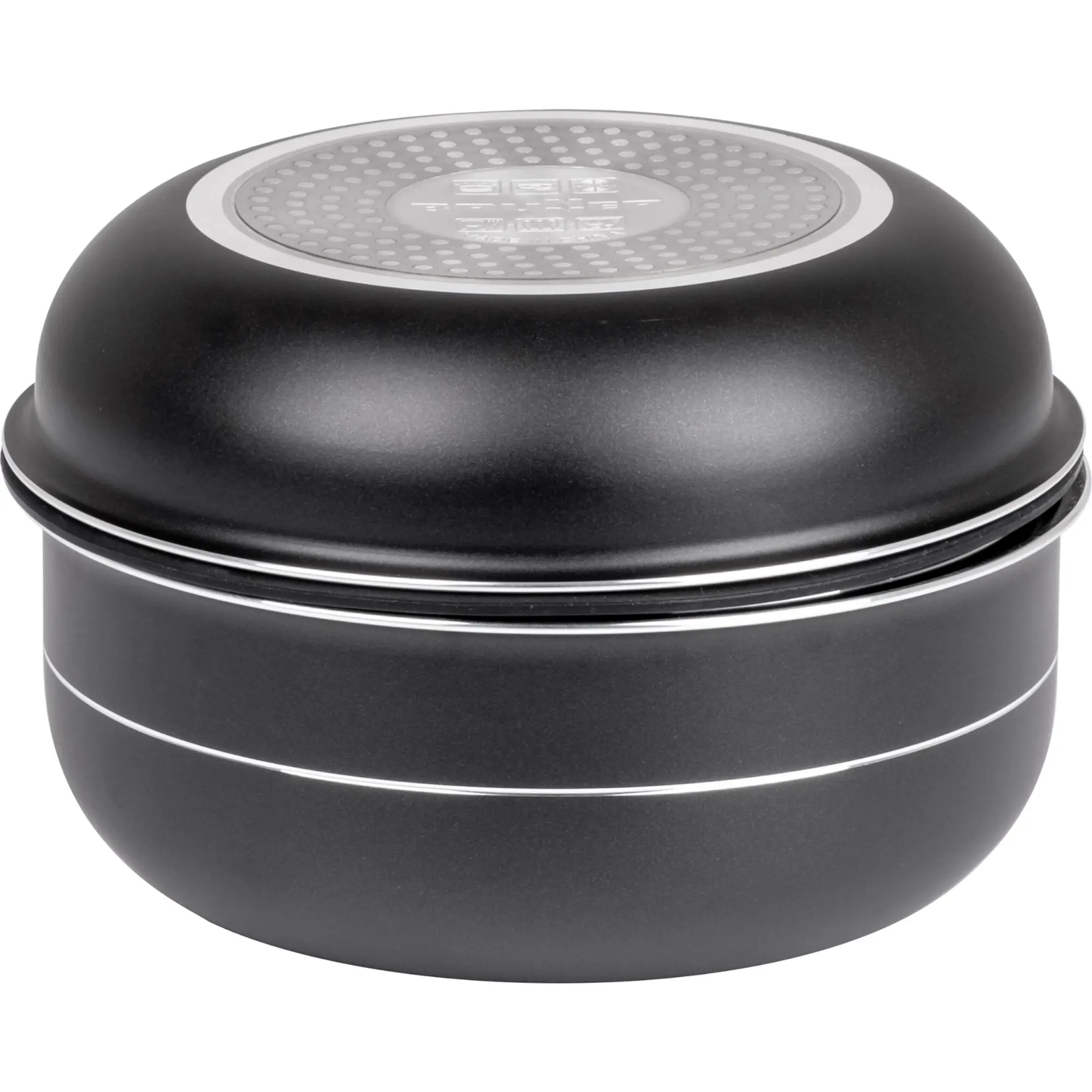 Topfsetkollektion mit 100% recyceltem Aluminiumkörper. Ausgestattet mit einer Antihaft-Innenbeschichtung, wärmeisolierenden Griffen für einen sicheren Halt und multifunktionalen Glasdeckeln mit Silikonrand.