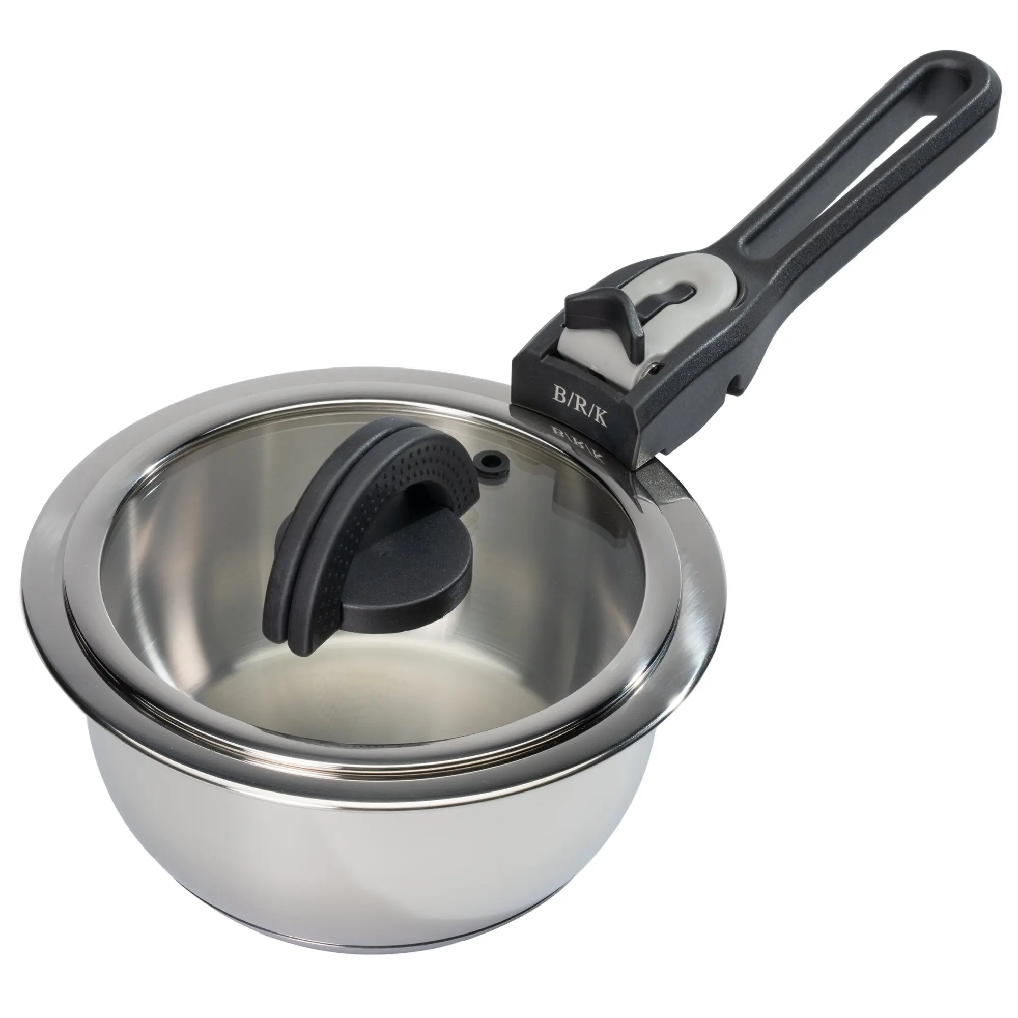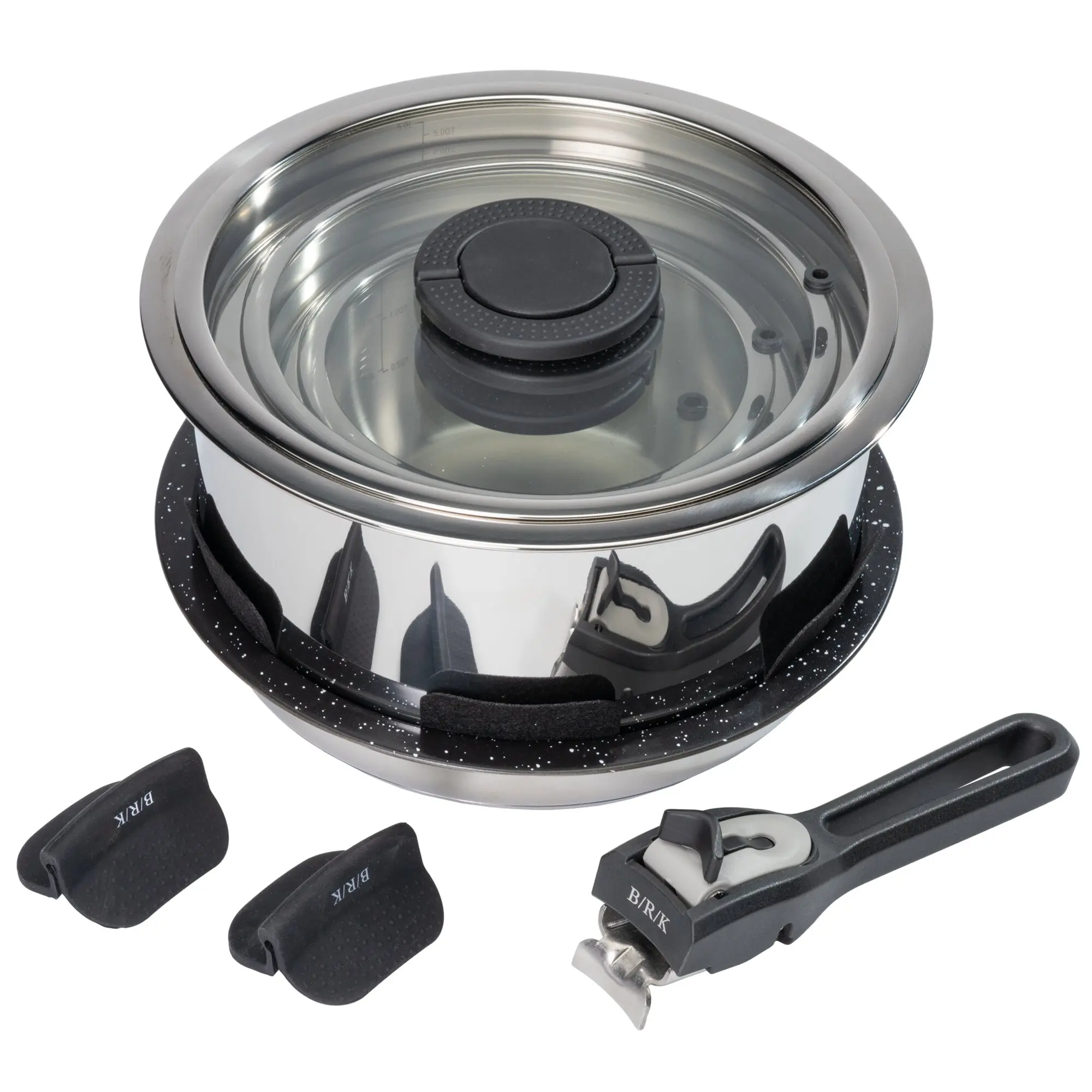 Das Click-On Kochtopfset überzeugt mit abnehmbaren, patentierten Griffen, die sich an allen Töpfen und Pfannen flexibel anbringen lassen. So gelingt das Kochen, Braten und Servieren besonders komfortabel.