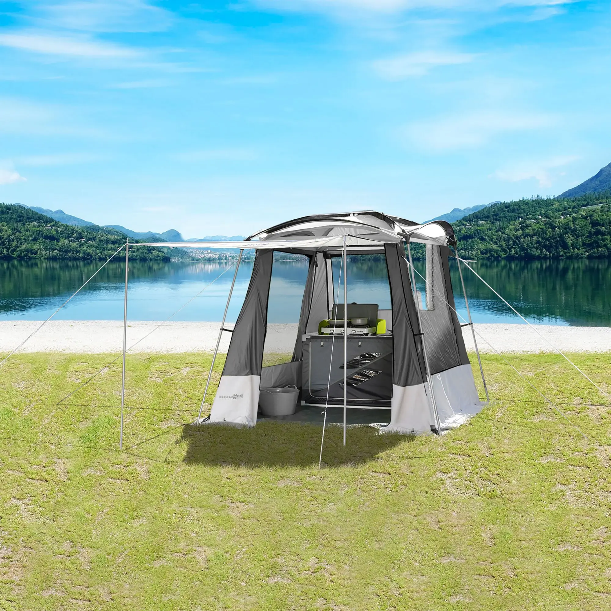 Vielfach einsetzbares Küchen- und Materialzelt mit stabilem Stahl-/Fiberglasgerüst, grossen Fenstern und einer hochrollbaren Eingangstür. Mit Rundum-Erdstreifen. Inkl. Montagematerial und Packsack.
