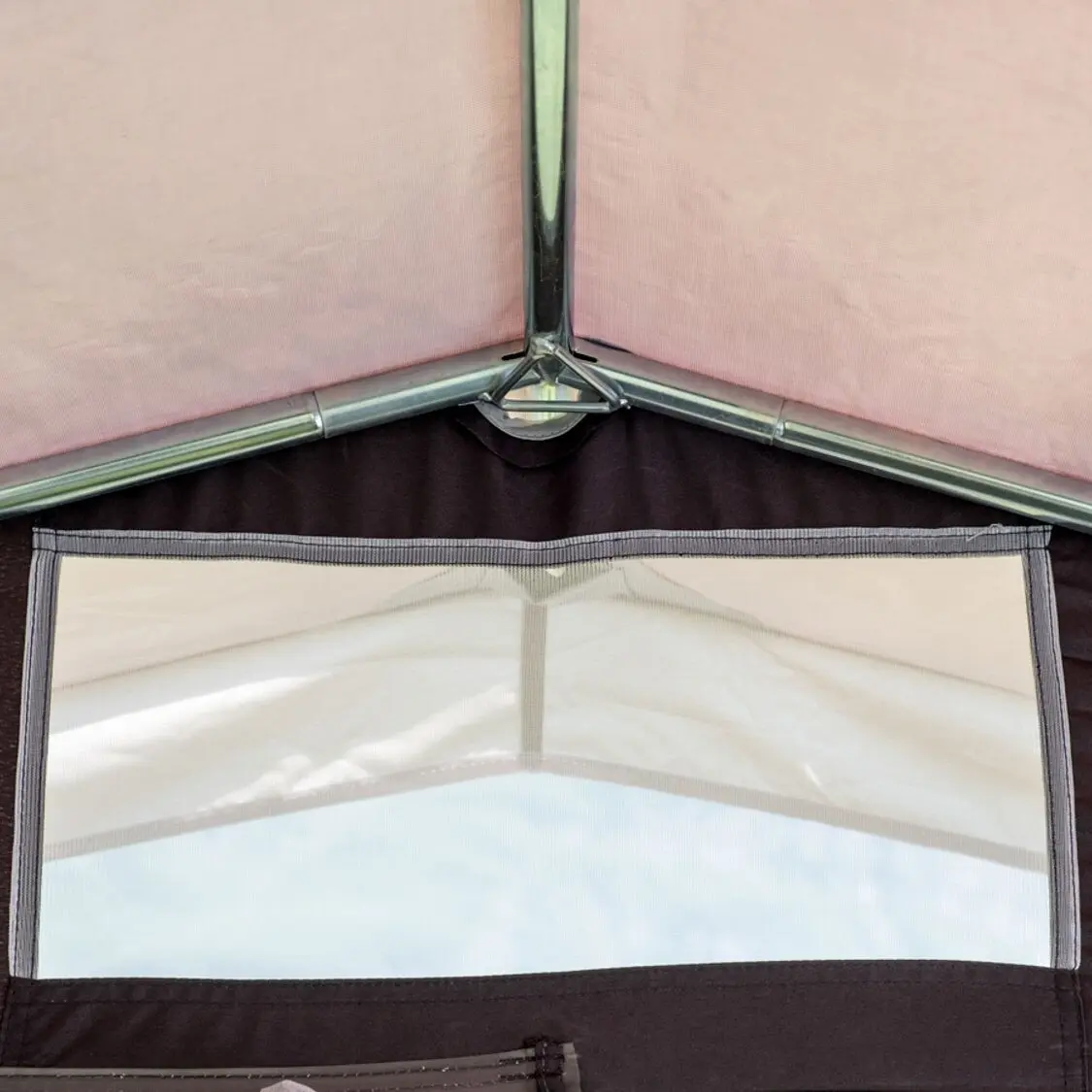 Küchenzelt mit Pultdach. Große, verschließbare Fenster mit Moskitogaze. Die vergrößerte Eingangstür und die zusätzlichen Lichtfenster sorgen für mehr Licht im Küchenzelt.