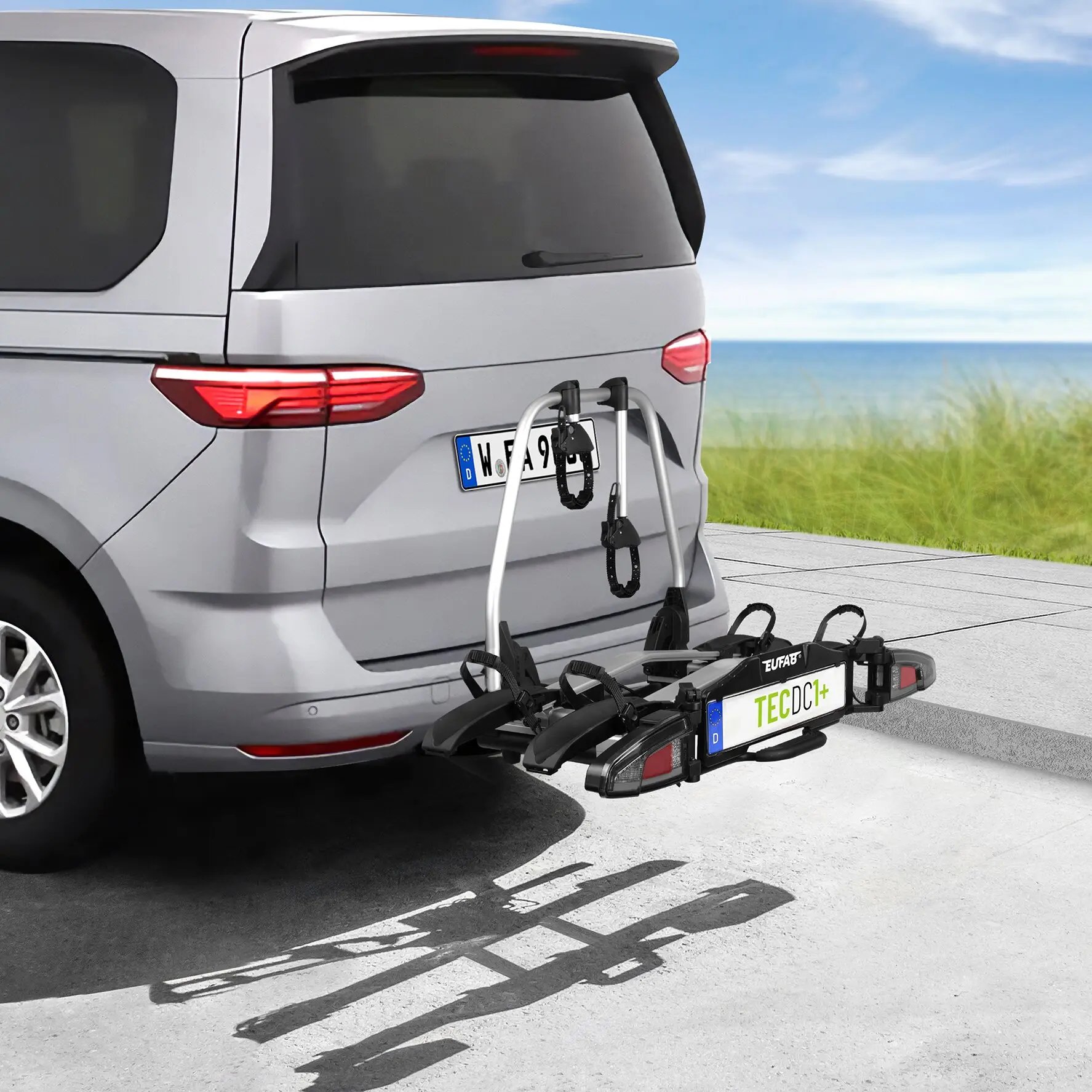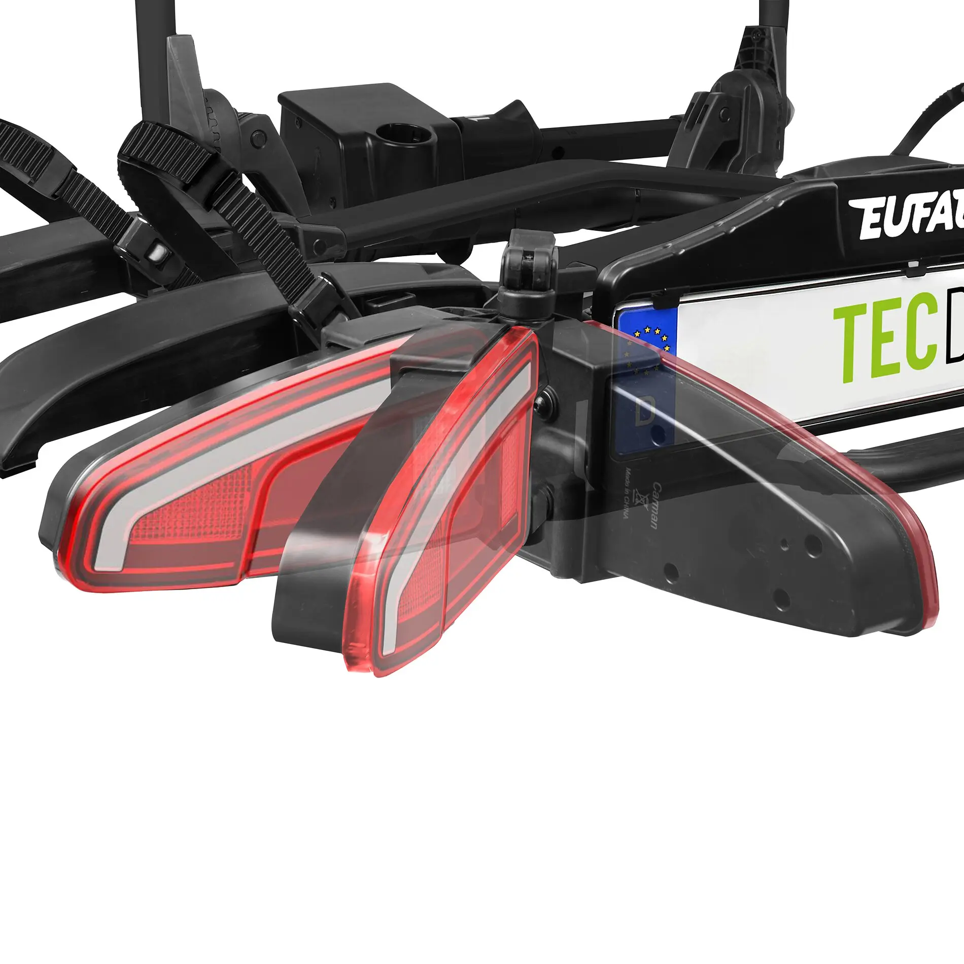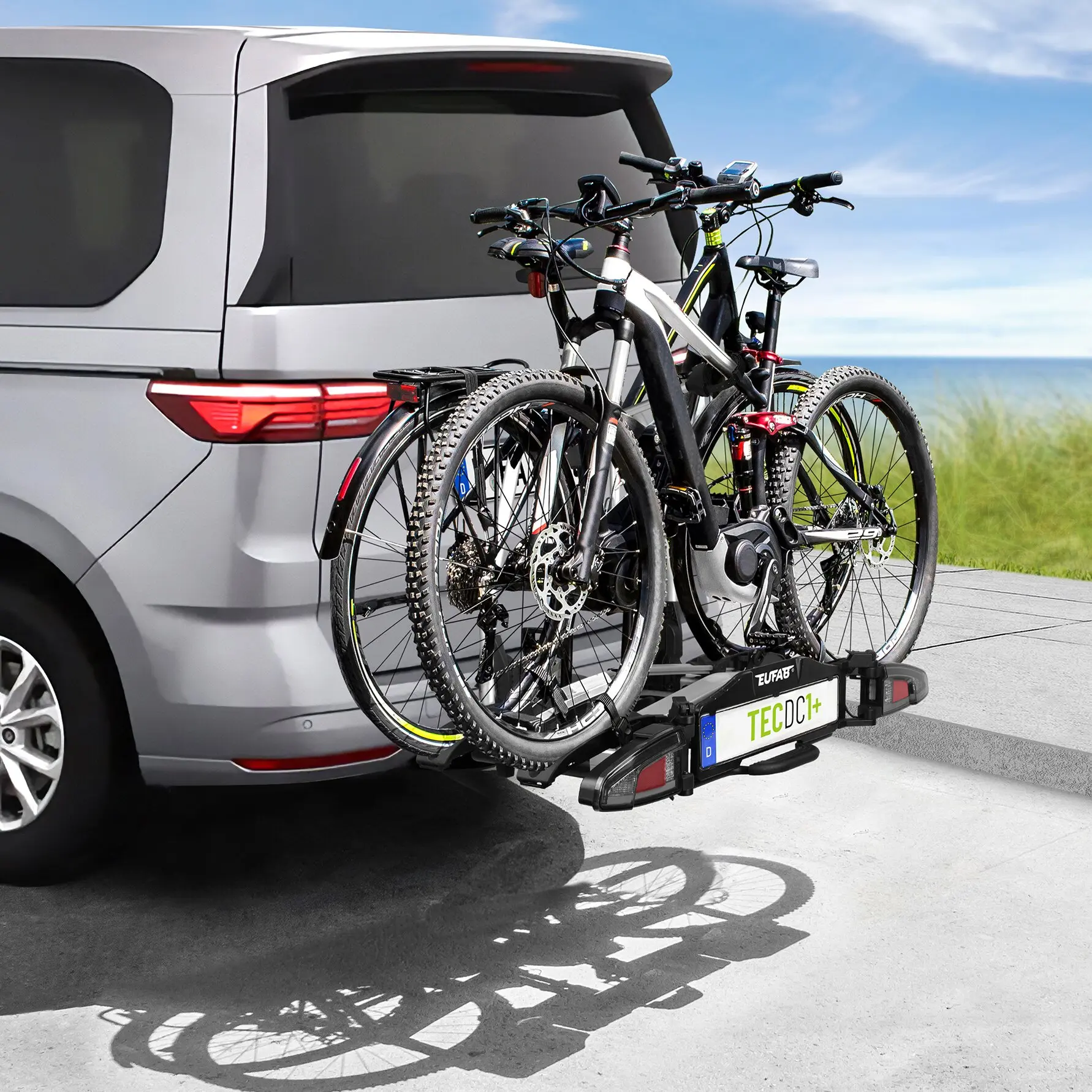 Der EUFAB TECDC1+ ist ein hochwertiger Kupplungsträger für zwei Fahrräder oder zwei E-Bikes. Er kombiniert elegantes schwarzes Design mit modernen LED-Rückleuchten und dynamischem Blinklicht – für zuverlässige Sicherheit mit Stil. Durch die Abklappfunktion per Fußpedal, das Schnellverschluss-System und die vormontierte Lieferung ist die Handhabung besonders komfortabel. Der Kupplungsträger eignet sich ideal für Fahrzeuge mit großen Heckklappen wie Transporter oder Vans. Abschließbare Rahmenhalter und Spanngurte bieten Diebstahlschutz, stabile Stahlschienen tragen bis zu 60 kg – ideal auch für E-Bikes – und nehmen Radstände bis 130 cm sowie Reifen bis 3,25 Zoll auf.