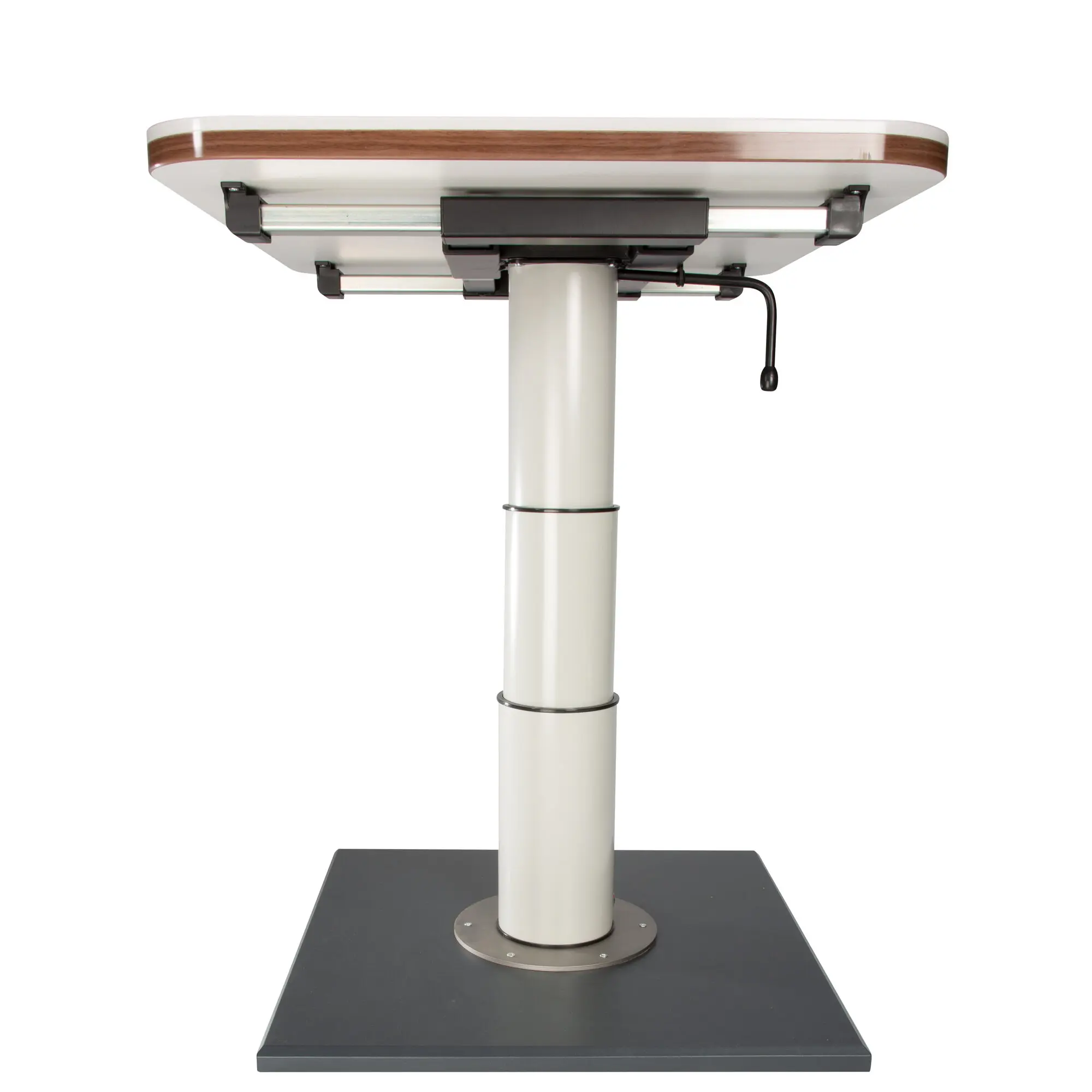 Höhenverstellbar um 37,5 cm. Die untere Höhe bis zur Unterkante der Tischplatte beträgt 34 cm, die obere Höhe 71,5 cm. Die Tischverschiebung erfolgt über eine zentrale Verriegelung. Quer- und Längsverschiebung sind jeweils 23,5 cm und 27,5 cm möglich. Tischplatte und Montageuntergrund sind nicht im Lieferumfang enthalten.