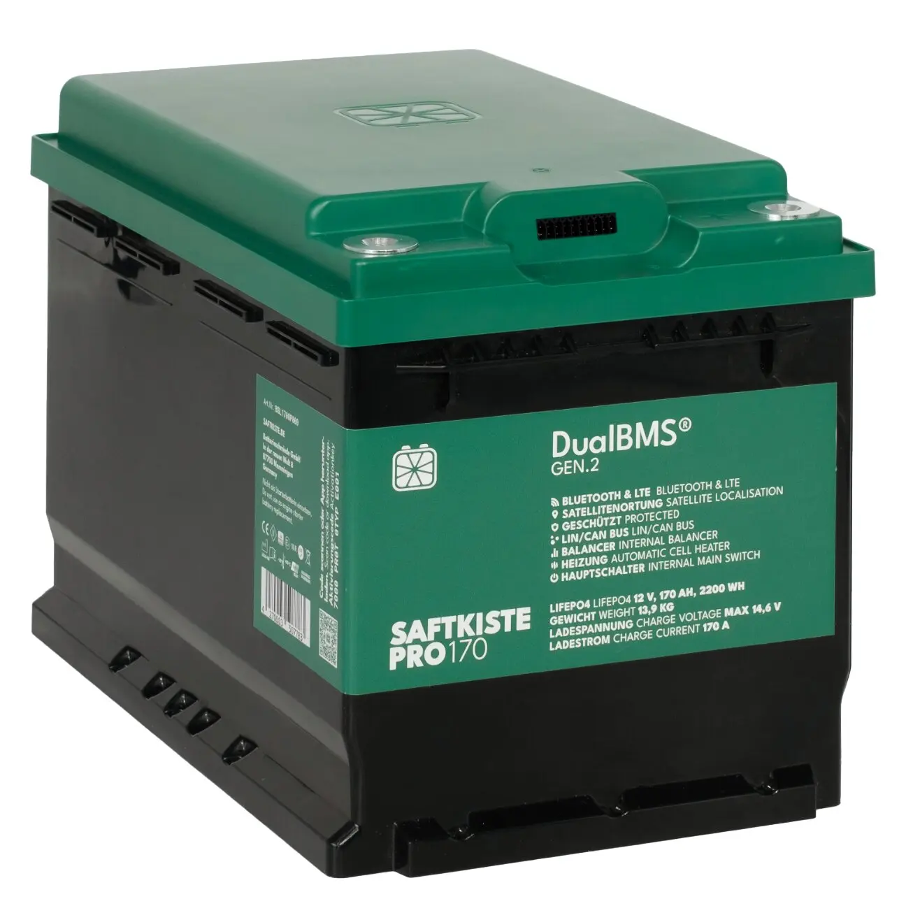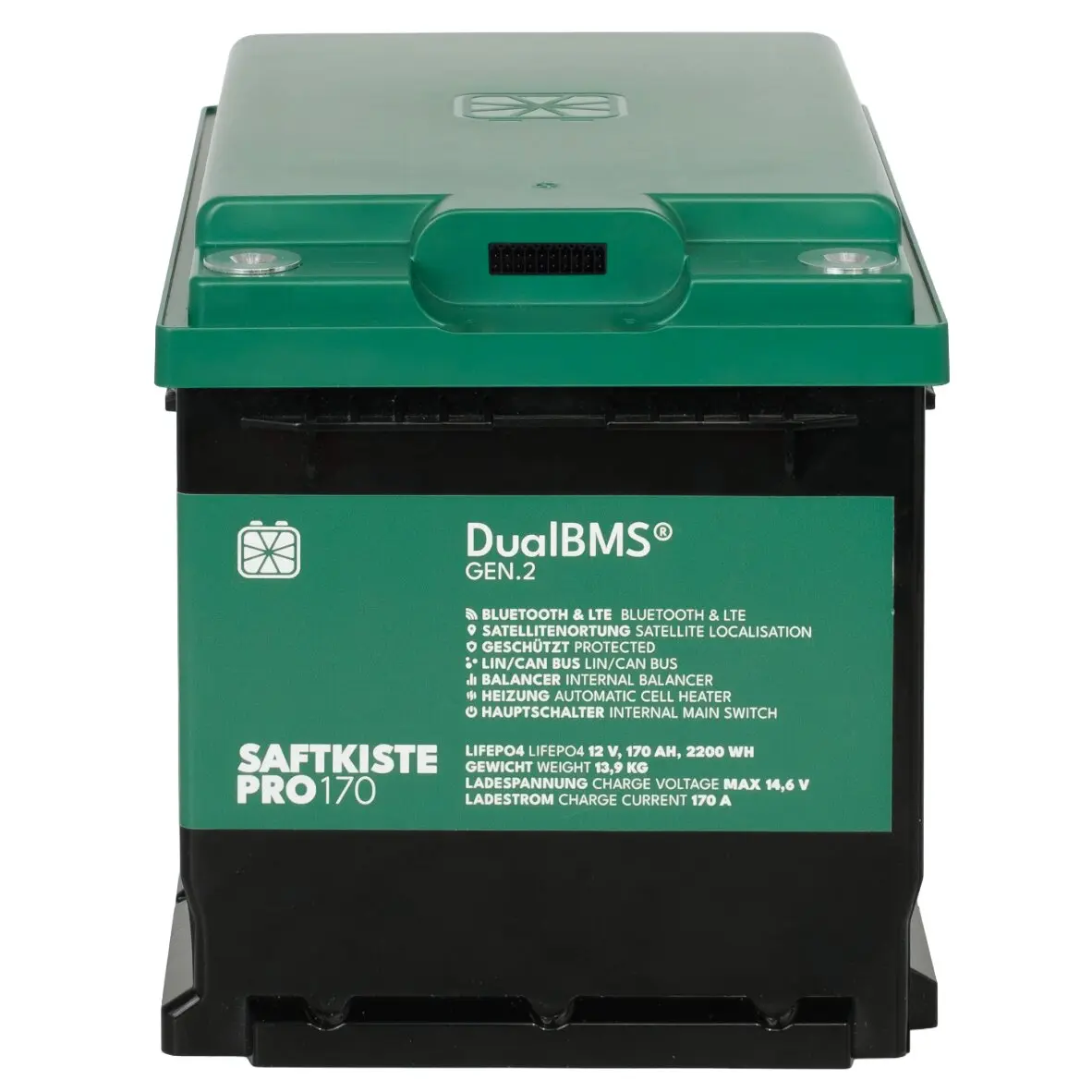 - Integriertes DualBMS® „Made in Germany“ für präzise Zellüberwachung sowie Schutz vor Überladung, Tiefentladung, Überhitzung und Kurzschluss.