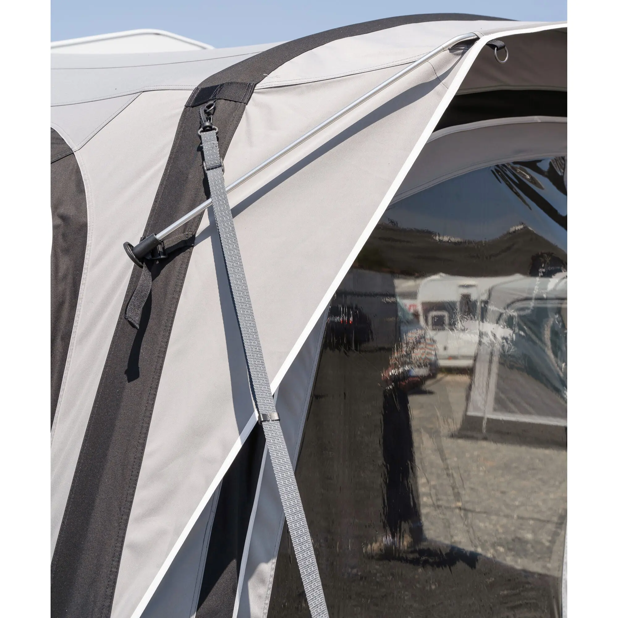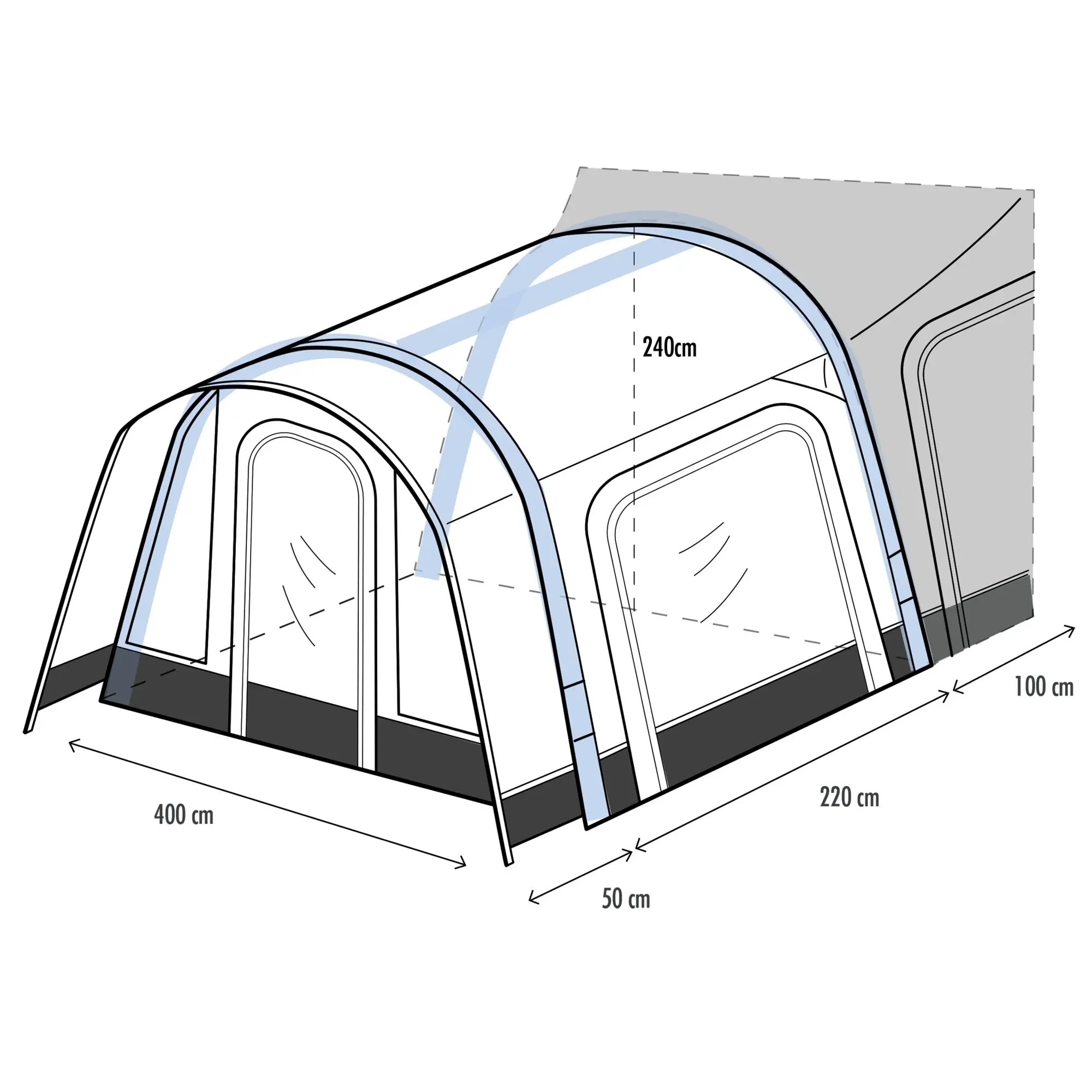 Das Neptune ist ein speziell für Wohnmobile entwickeltes Luftvorzelt. Durch die vier verschiedenen Schleusen, die mit dem Neptune kombiniert werden können, variiert die Anbauhöhe von 240 – 320 cm. Das Besondere an diesem Luftvorzelt ist der extrahohe Dachverlauf, der es ermöglicht, die Fahrzeugtür ohne Probleme zu öffnen. Das Neptune ist mit großen Panoramafenstern ausgestattet.