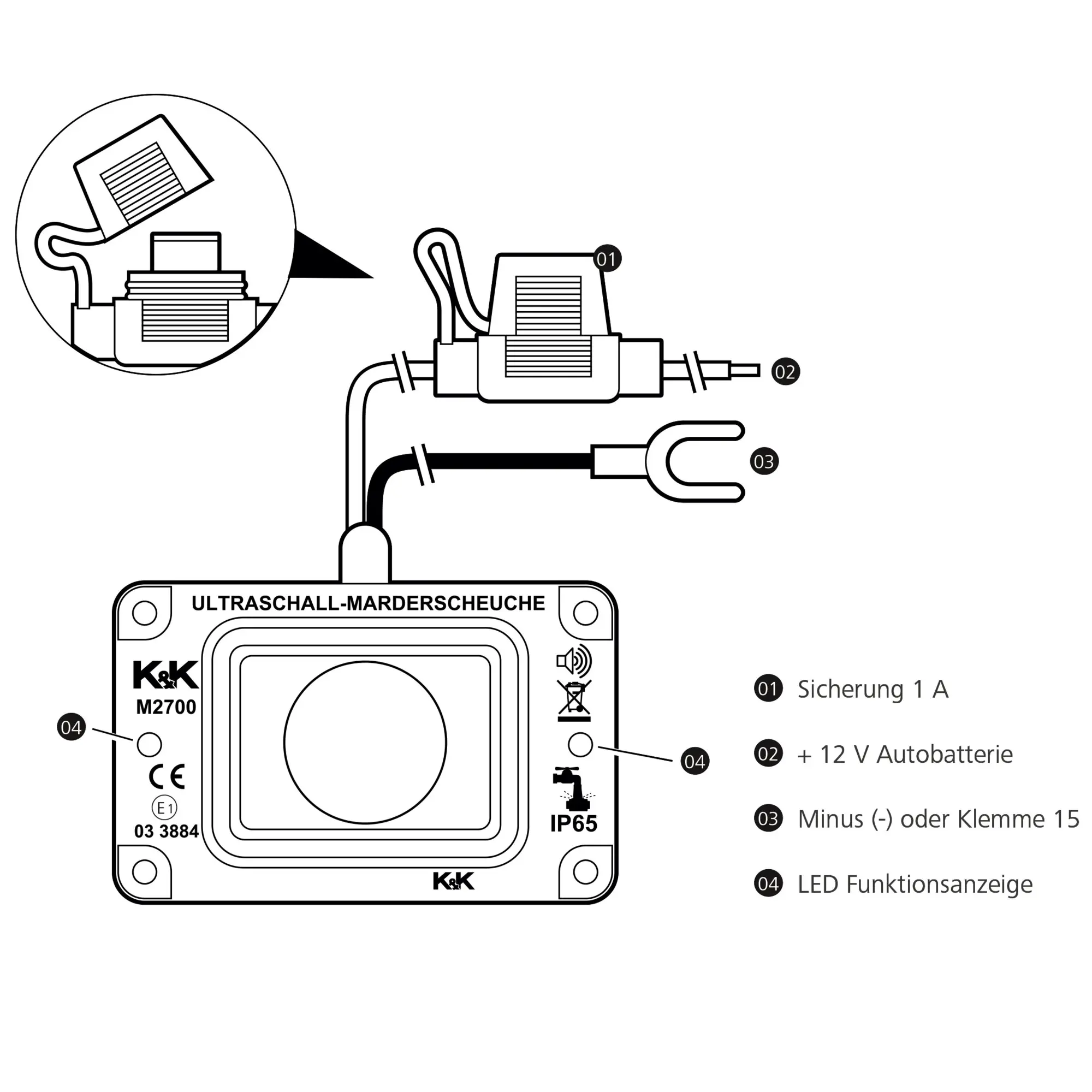 Das wasserdichte und schmutzbeständige M2700 ist ein Ultraschall-Marderabwehrgerät und verhindert Bissschäden schon im Ansatz. Es kann im Gegensatz zu vielen anderen Ultraschallgeräten genau dort platziert werden, wo es gebraucht wird – ganz unten. Denn von dort aus gelangen die Marder ins Auto. Dank des komplett verschlossenen 360°-Kuppellautsprechers können Sie es bedenkenlos im Motorraum einbauen (auch im Spritzwasserbereich). Dort errichtet das Gerät eine 360°-Ultraschallbarriere. So können sich Marder nicht im Schallschatten anschleichen. Selbstverlöschender Kunststoff, E1-Zeichen des Kraftfahrbundesamtes. Für alle Motorengenerationen geeignet. Maße Basisgerät: 8,5 x 5,3 x 4,2 cm.