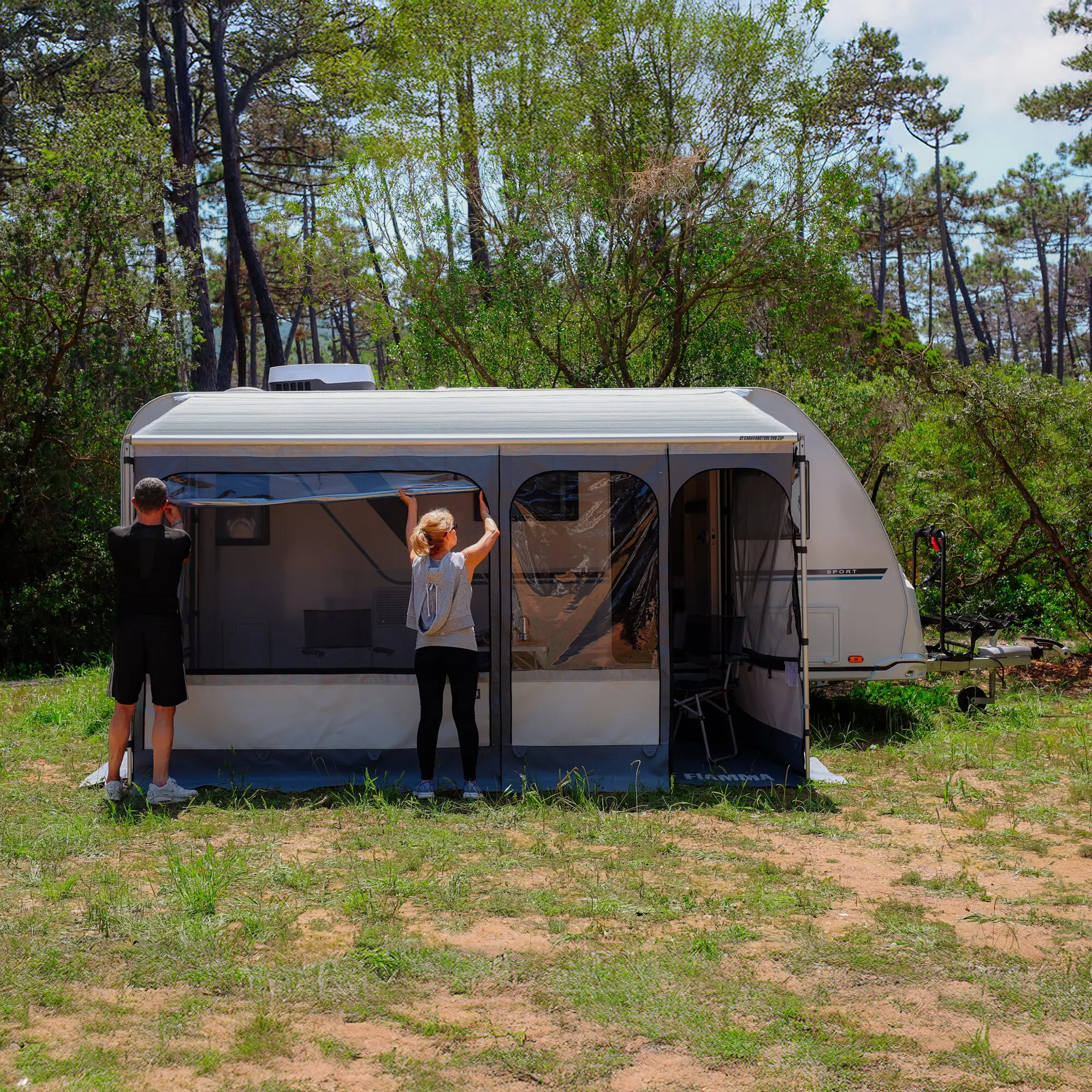 - kann in Kombination mit dem optional erhältlichen Markisenzelt Privacy CaravanStore ZIP XL/EVO ZIP und der passenden Frontwanderweiterung zu einem vollständigen Vorzelt ausgebaut werden