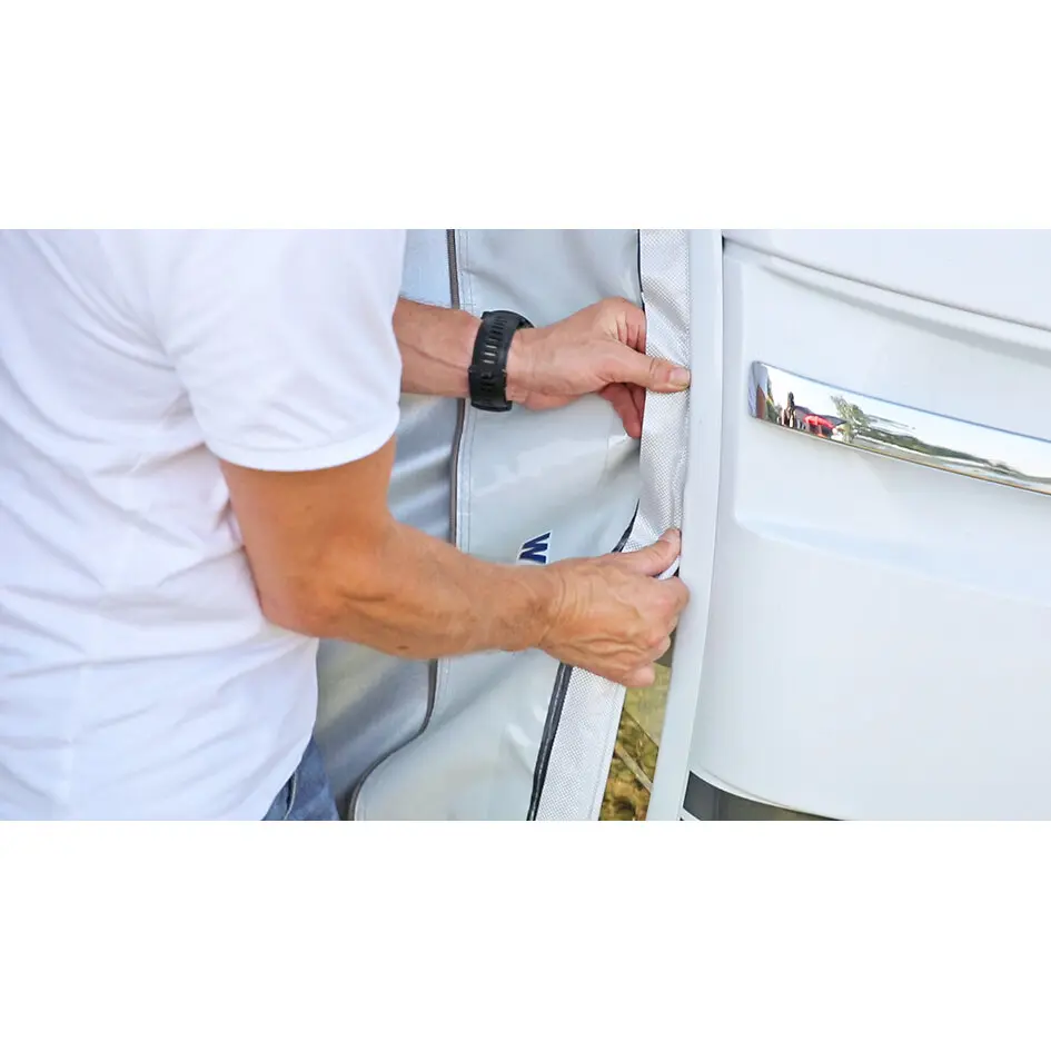 Die Wigo-Markise Rolli Plus mit dem stabilen Frontprofil wird in die Kederschiene am Wohnwagen eingezogen. In ihrem Sack zusammengerollt ist die Markise optimal geschützt, transportabel und kann auch während der Fahrt montiert bleiben. Der Vorteil beim Aufbau: Der größte Teil des Zeltes, das Dach, ist bereits eingezogen, so dass lediglich noch das Gestänge montiert und die Markise abgespannt werden muss. Sie besteht aus der vollsynthetischen Spezialdachware TenCate All Season mit einseitiger Beschichtung. Die Unterseite ist bedruckt, um die Schwitzwasserbildung zu reduzieren. Durch das Wellensystem mit Dach- und Aufstellstangen aus 28 mm starkem Aluminium ist der Aufbau noch leichter und stabiler. Durch einfaches Drehen werden die Stangen in ihrer Position fixiert und können dabei individuell positioniert werden. Auszug 2,5 m, gegen Aufpreis auch als Sonderbestellung mit Auszug 3 m lieferbar.
