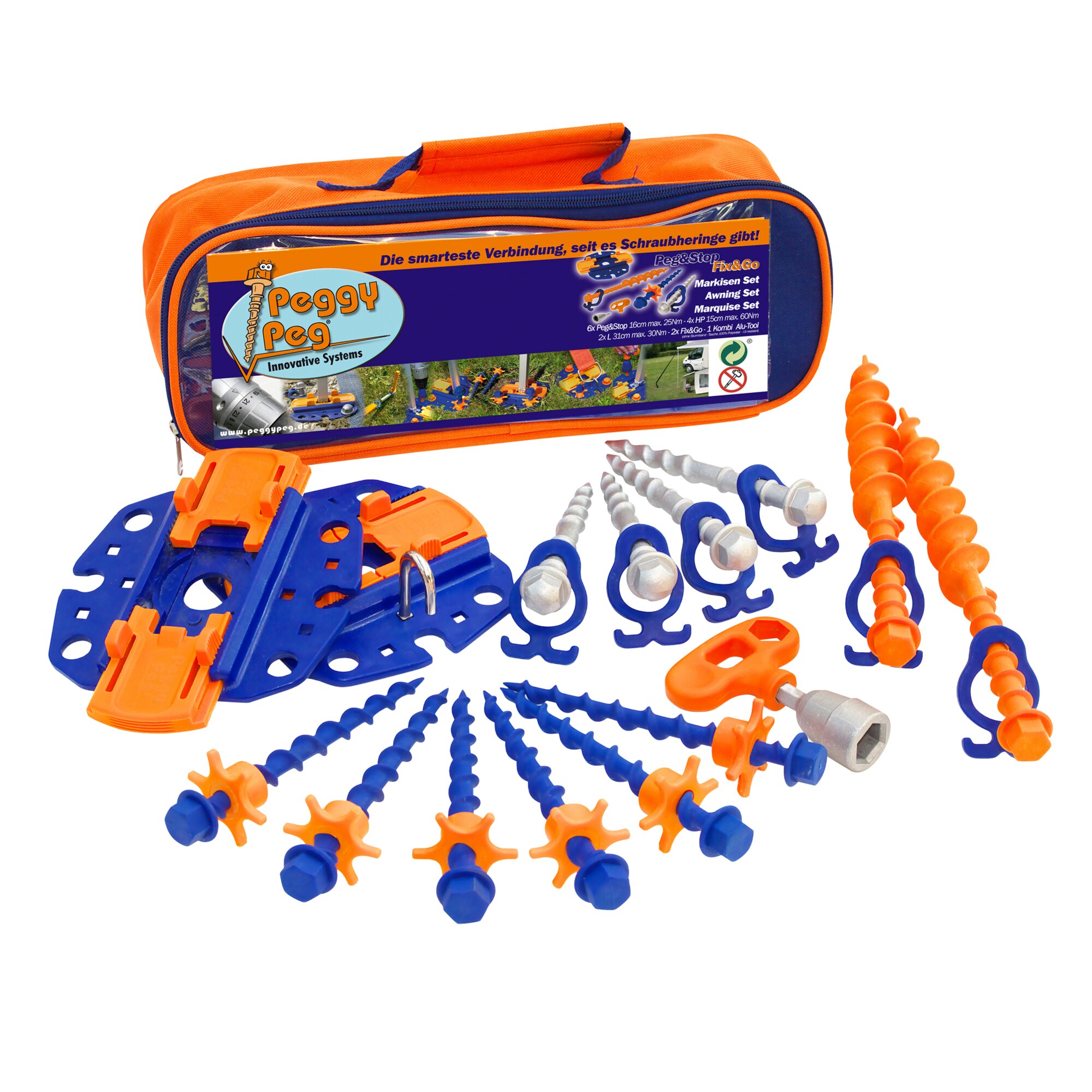 Dieses Set eignet sich zur Befestigung von Markisen, Sackmarkisen und Sonnendächern handelsüblicher Marken. Du kannst es auch zur Verankerung von Sturmbändern verwenden. Die bekannte Fix&Go Ankerplatte 2.0 ermöglicht dir, die Markise im Handumdrehen und ohne Werkzeug einzufahren. Der Schraubhering Peg&Stop mit Kontermutter erlaubt dir, die Schraube stufenlos zu fixieren, auch wenn sie nicht ganz eingeschraubt werden konnte. Der Schlagschraubhering komplettiert die Auswahl für harte und weiche Böden. Empfohlene Ergänzung: Peggy Peg Markisenband TieStrap und Fix&Go Bridge.
