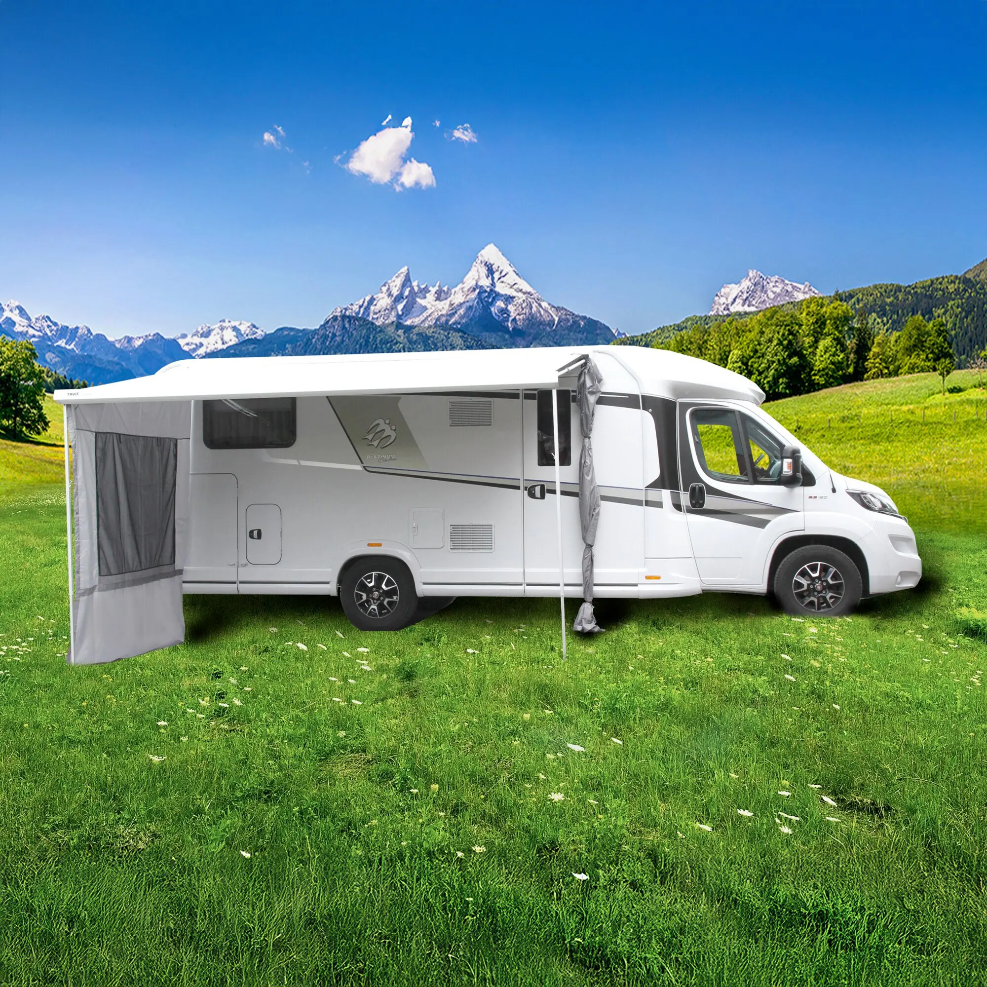 Die flexible und leichte Camper Lounge schafft im Handumdrehen mehr Raum, Schutz und Privatsphäre. Der werkzeugfreie Auf- und Abbau gelingt schnell, ideal für spontane Stopps. Das System umfasst zwei Seitenteile und ein Frontteil, das über den Keder in die Markisenleiste geschoben wird. Die Seitenteile lassen sich flexibel an Rafterstange (optional) oder Gelenkarm befestigen. Leinen, Heringe und Flatterstopp sind inklusive. Die Camper Lounge bietet zuverlässigen Schutz bei Sonne, Wind und leichtem Regen. Verschließbare Panoramafenster sorgen für Belüftung und Ausblick. Passend für Markisen mit 2,5 m Auszug und 3 m Breite – ideal für Wohnmobile.