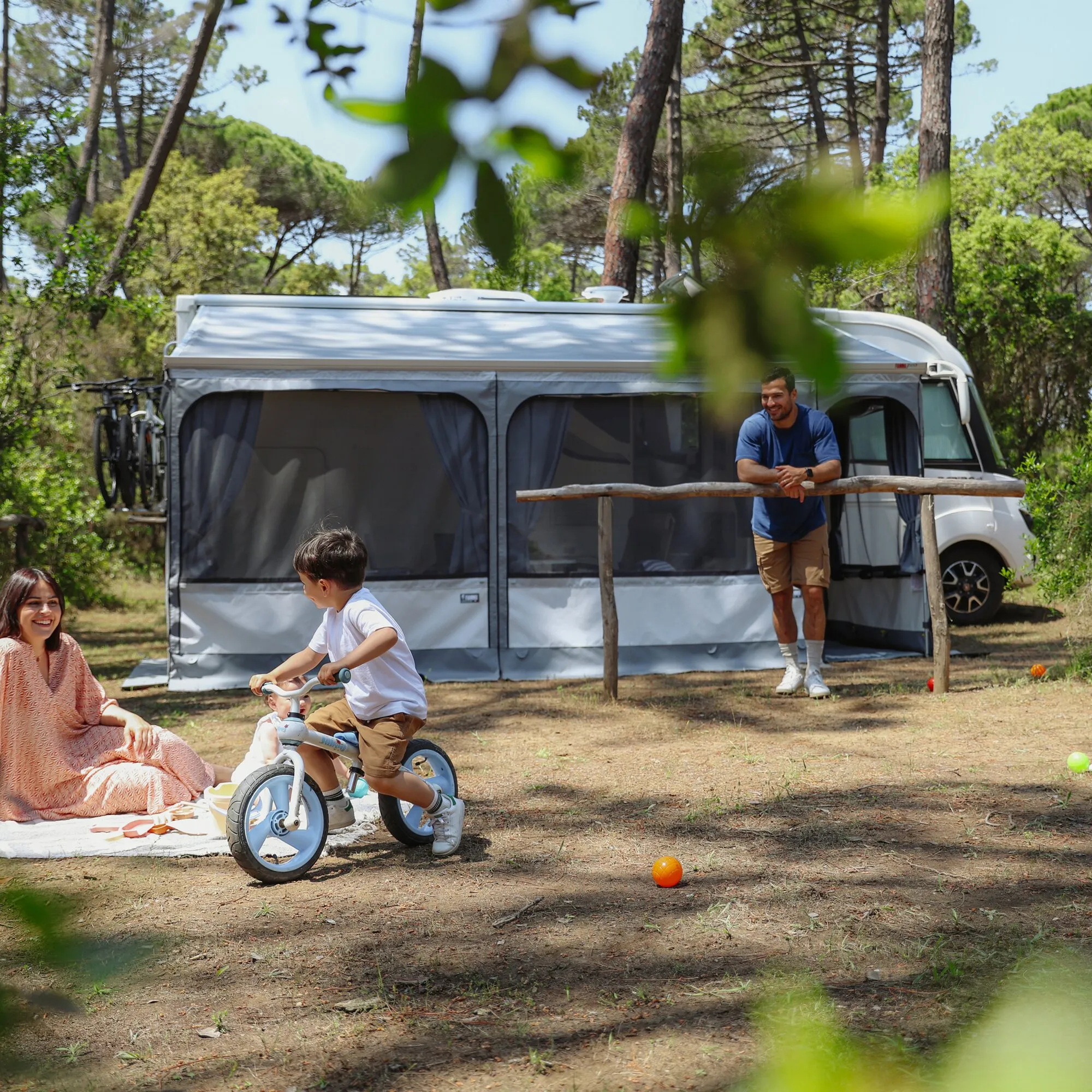 - aufrollbare Crystal-Fenster mit Moskitonetz und Vorhängen, verschließbar mit Klettverschlüssen