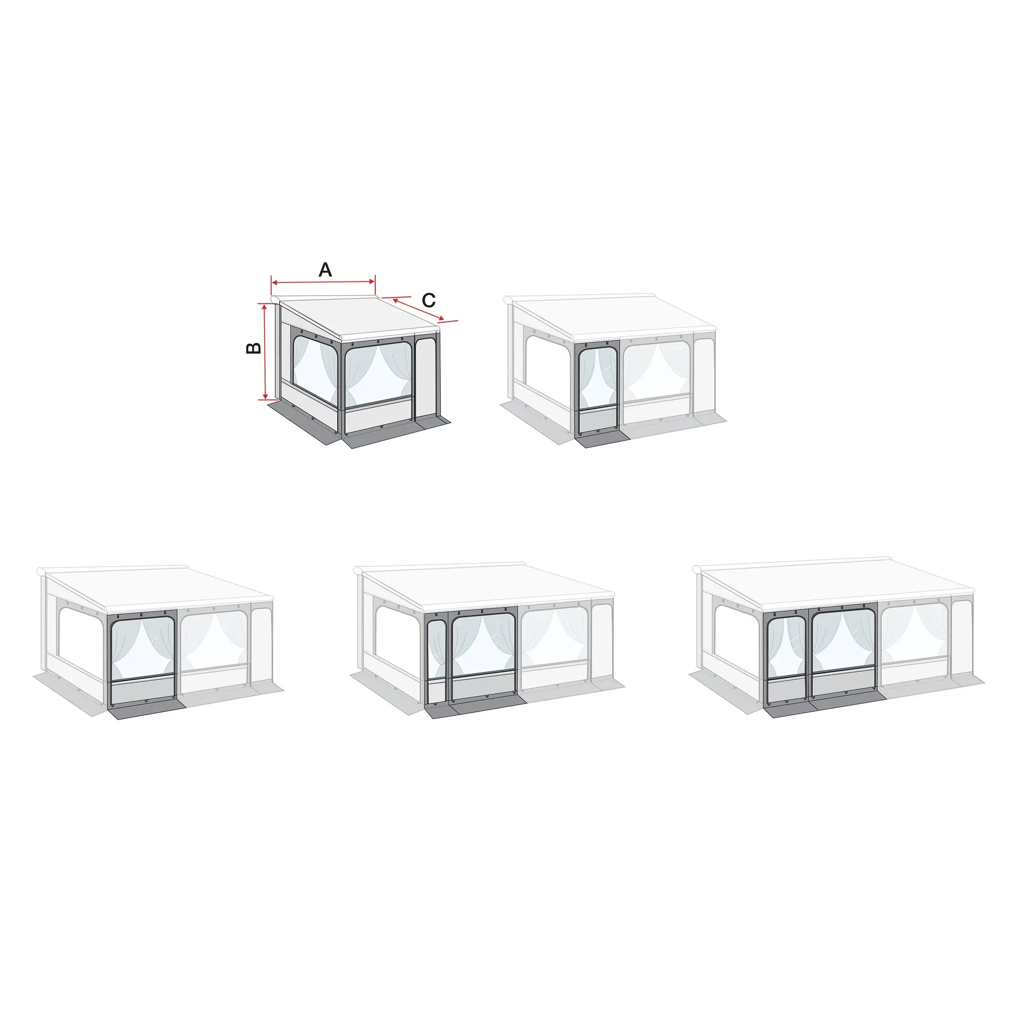 Das Privacy Room F80 ist in den Ausführungen Privacy Room 300 Ducato (und Baugleiche), Privacy Room 300 H3 (z. B. MB Sprinter und andere), Privacy Room 300 H (z. B. Wohnwagen Höhe 245 – 280 cm), Privacy Room 300 XL (Markisenauszug 275 cm, Höhe 245 – 280 cm) und Privacy Room 300 XXL (Markisenauszug 275 cm, Höhe 281 – 310 cm) erhältlich.
