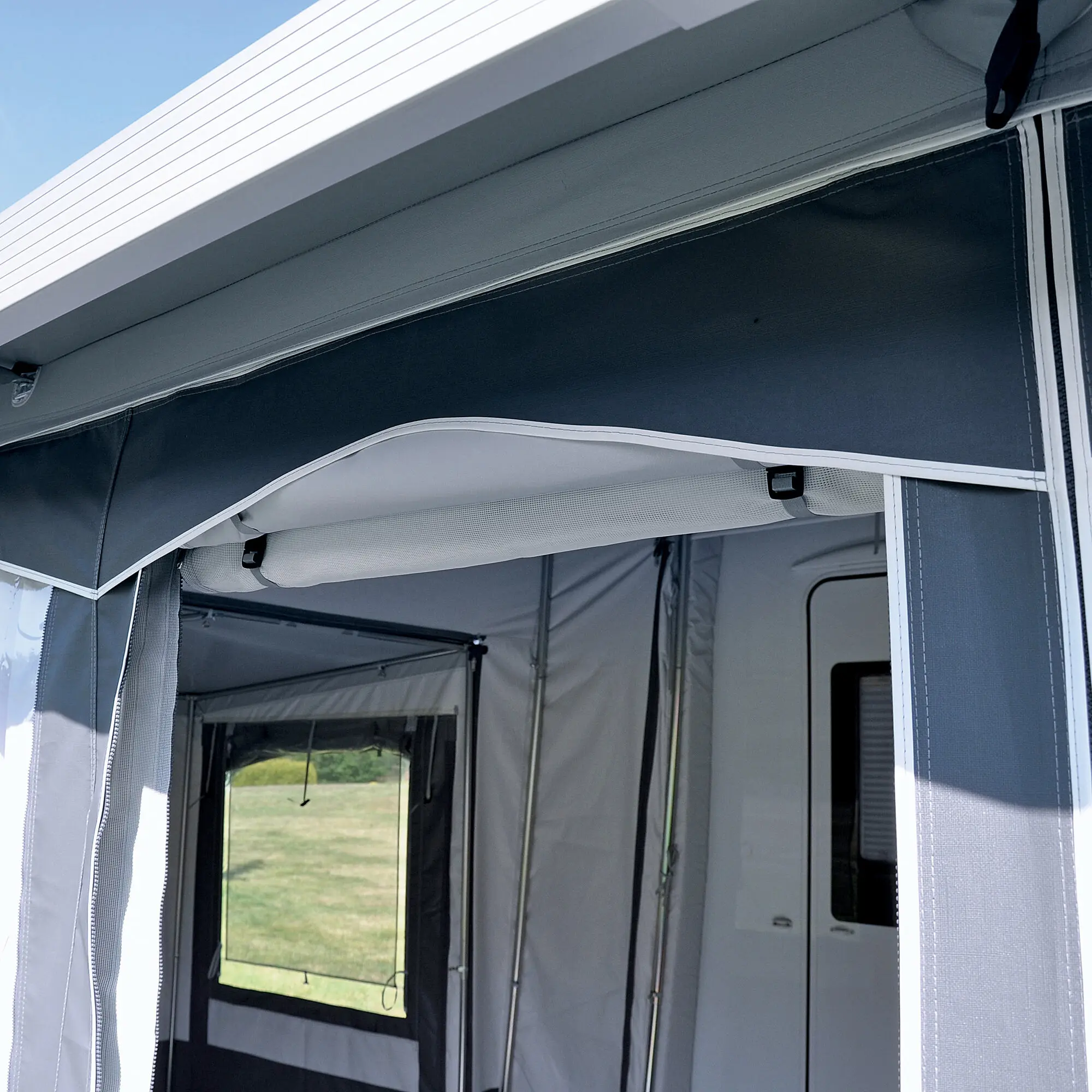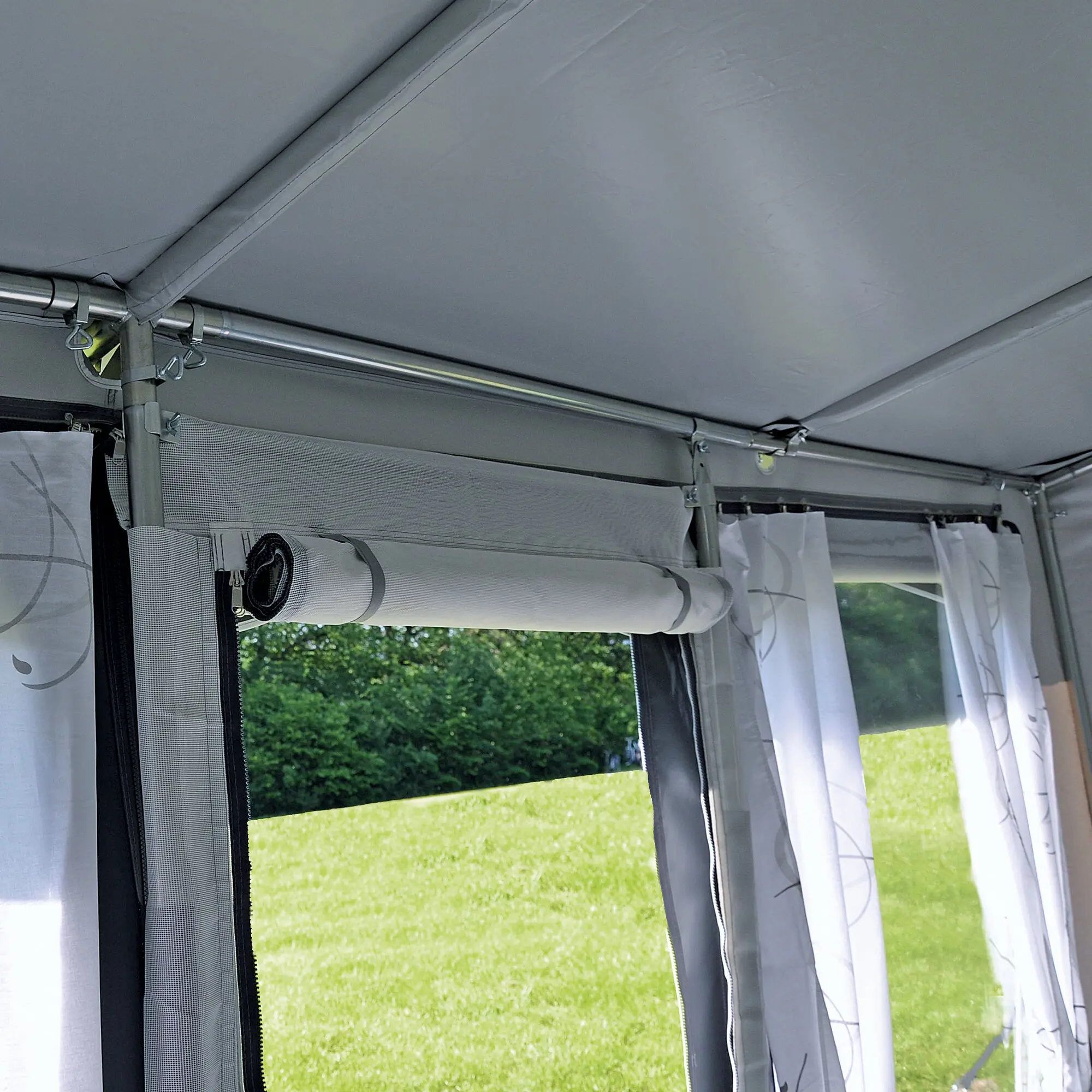 Hochrollbare Moskitonetztür für den Vorzelteingang. Du befestigst sie mit der Verandastange und Schellen zwischen zwei senkrechten Stangen.