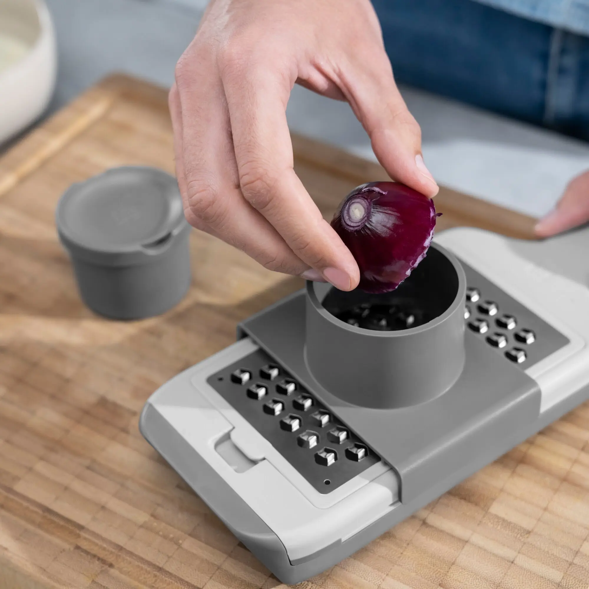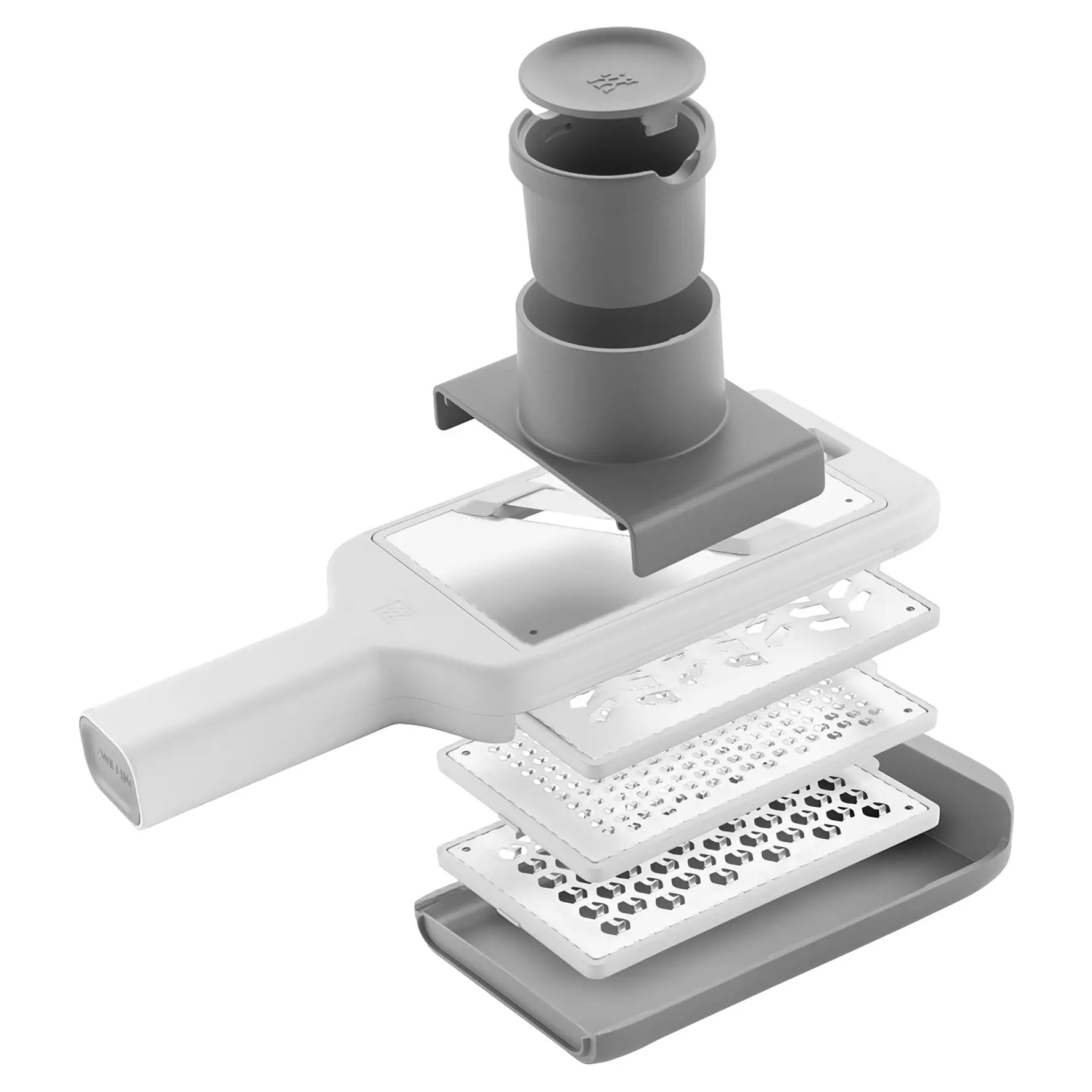 Multischneider, Gemüsehobel und Handreibe in einem. Mit vier austauschbaren Klingen (feine Reibe, mittlere Reibe, grobe Reibe und Schneide). Mit abnehmbarem Lebensmittelaufsatz, Auffangbehälter und integriertem Fingerschutz. Spülmaschinengeeignet.