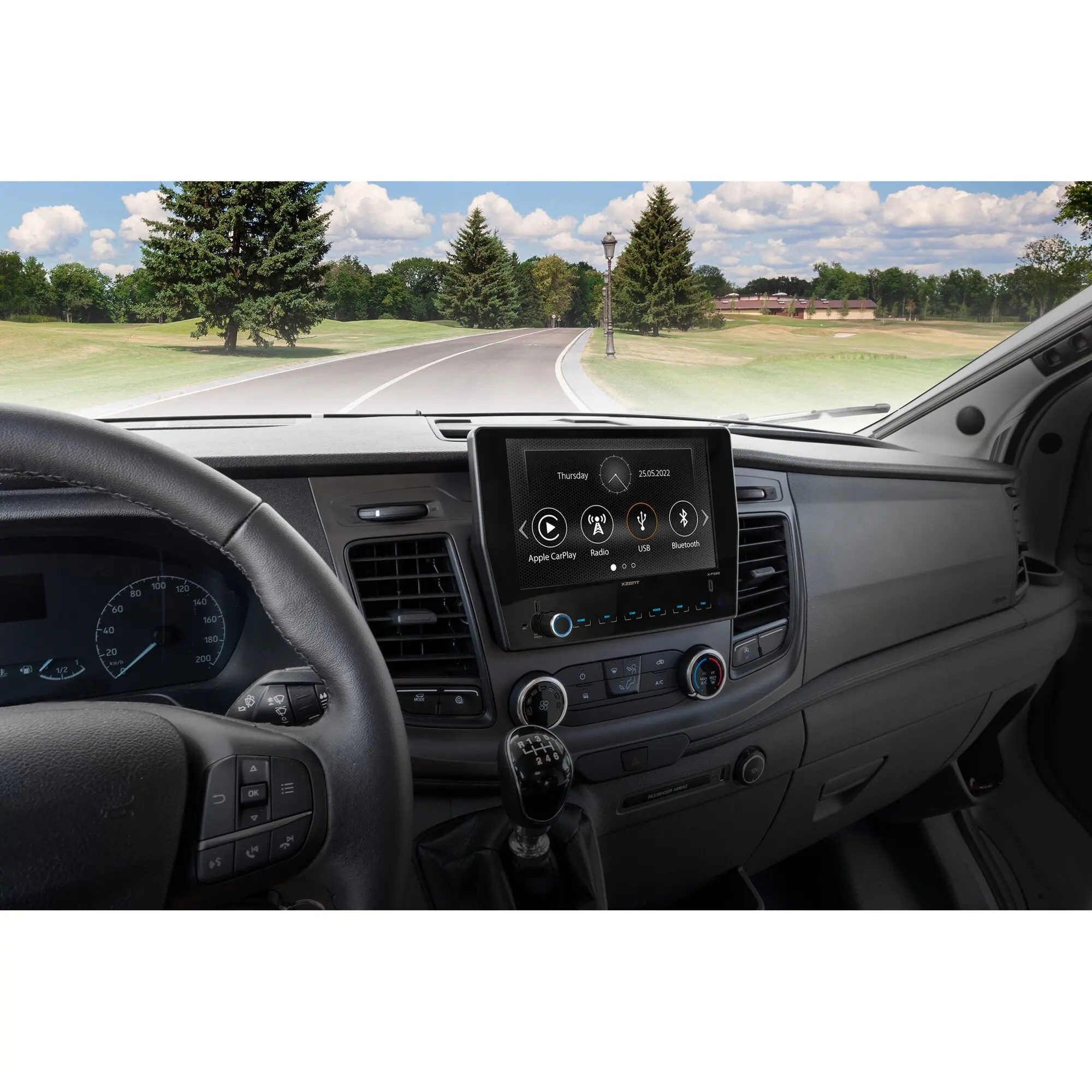 Passend für Ford Transit, Baujahr 2019/07 – 2024/09. Großer kapazitiver 9“/22,9 cm Echtglas-Touchscreen mit 6 Sensortasten.