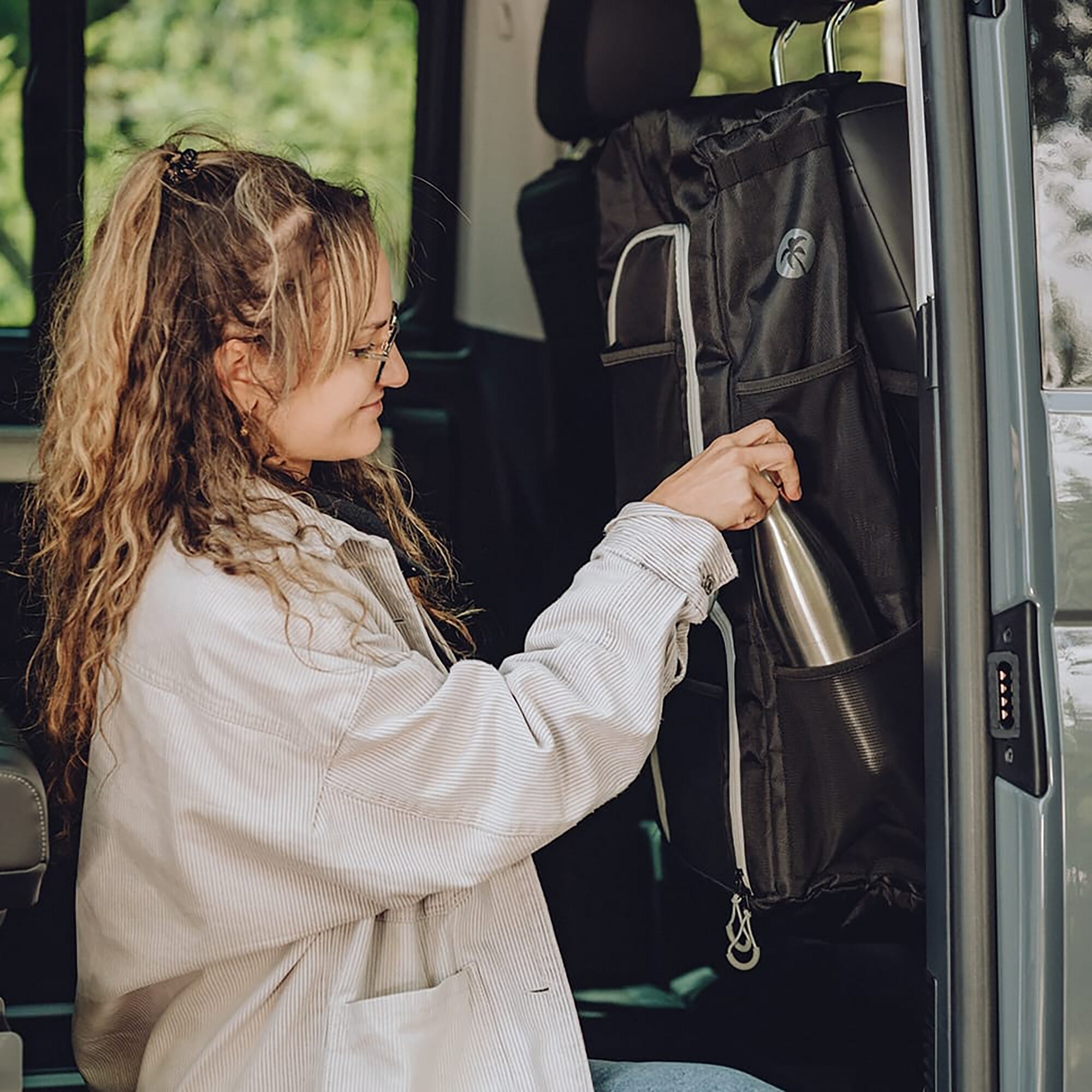Optimieren Sie Ihren Stauraum mit der seatBOXX! Perfekt für die Vordersitze des T5/T6/T6.1, bietet sie 72 l Volumen. Klappbare Böden schaffen Flexibilität und praktische Schlaufen erleichtern das Einhängen von Utensilien. Material: 100 % 600D Polyester.