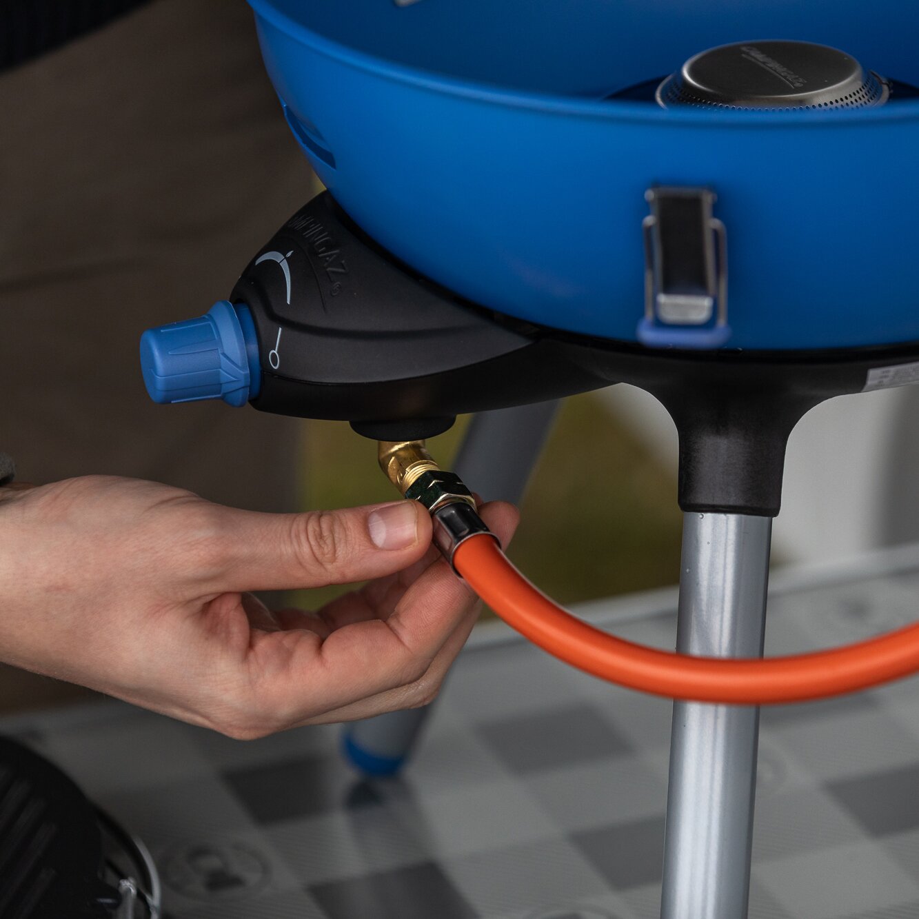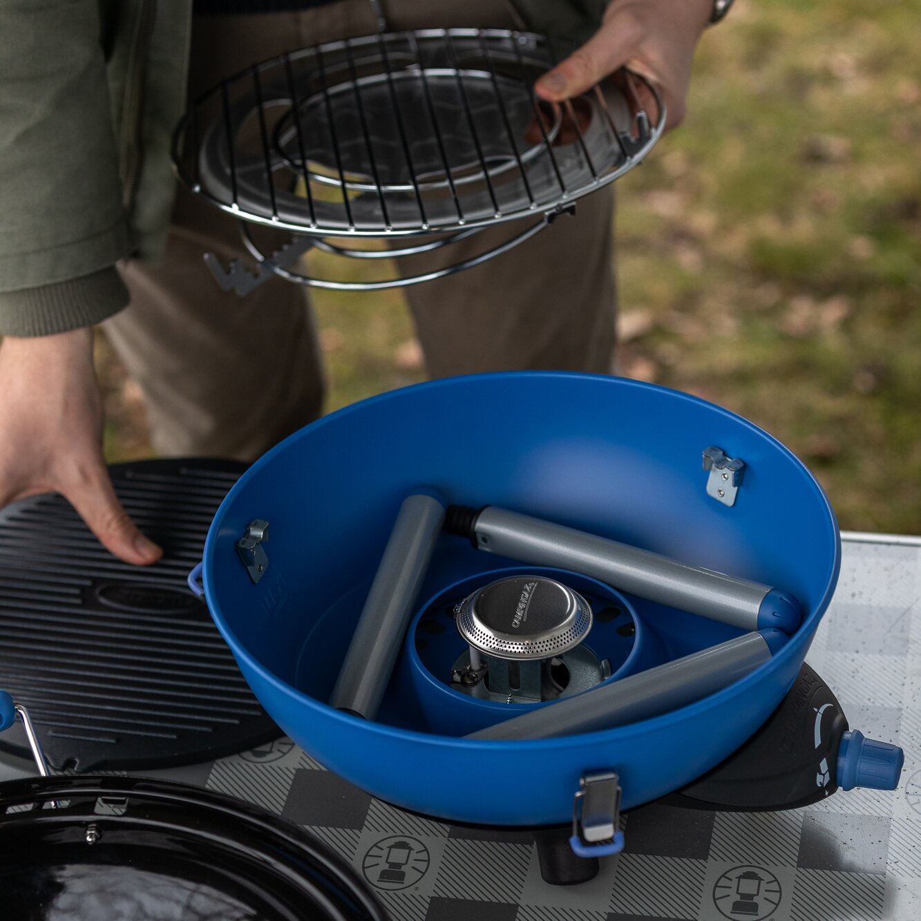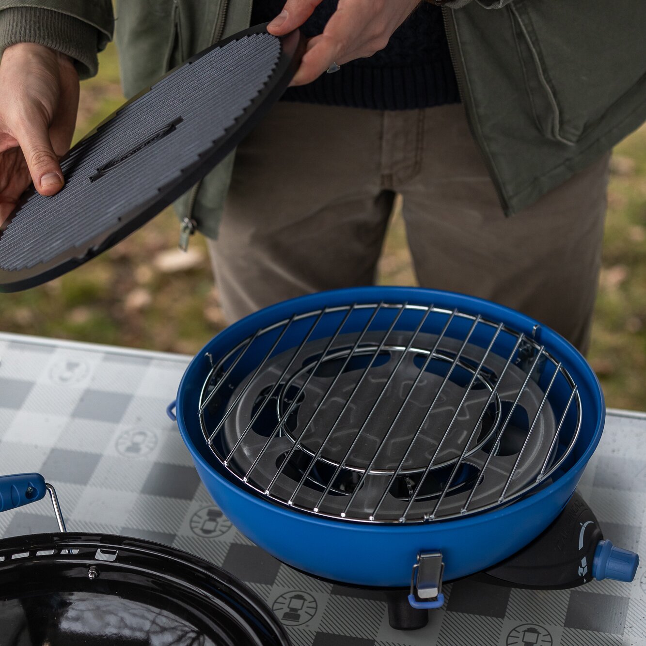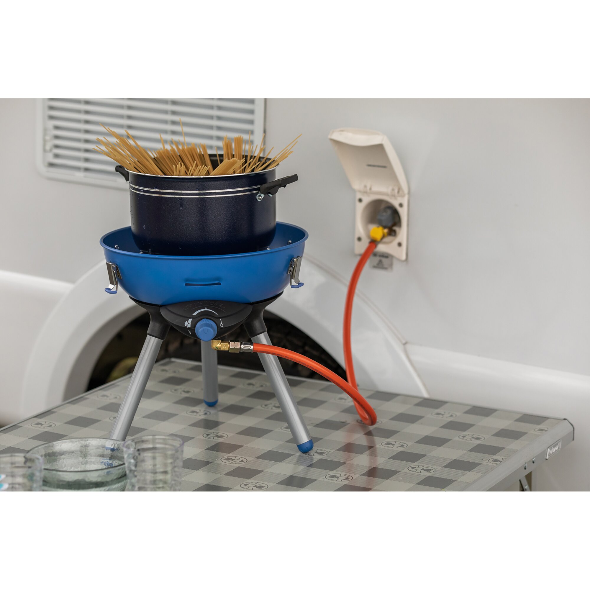Der Campingaz Party Grill 400 in der 30 mbar Variante mit Wohnwagenanschluss kann sicher und einfach mit dem Gassystem des Fahrzeugs verbunden werden. Somit muss zukünftig die schwere Gasflasche nicht extra aus dem Fahrzeug geholt werden. Der Party Grill ist ein leicht transportabler Gaskocher, mit dem Sie viele unterschiedliche Gerichte wie Pasta, Pancakes oder klassisches Grillgut zubereiten können. Der praktische Deckel schützt nicht nur während des Transports, sondern kann auch ganz praktisch als Wok genutzt werden. Die Grillfläche ist antihaftbeschichtet und die Hitzezufuhr ist über einen Drehknopf sehr fein regelbar. Fett und Fleischsaft tropfen in die Wasserschale, so werden Rauch und Stichflammen verringert. Praktische Standbeine können ganz einfach angebracht werden und werden zum Transport oder zur Lagerung im Grill verstaut.