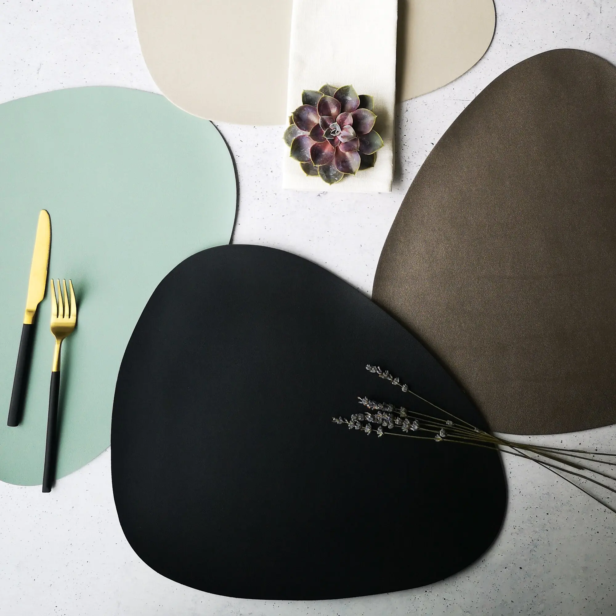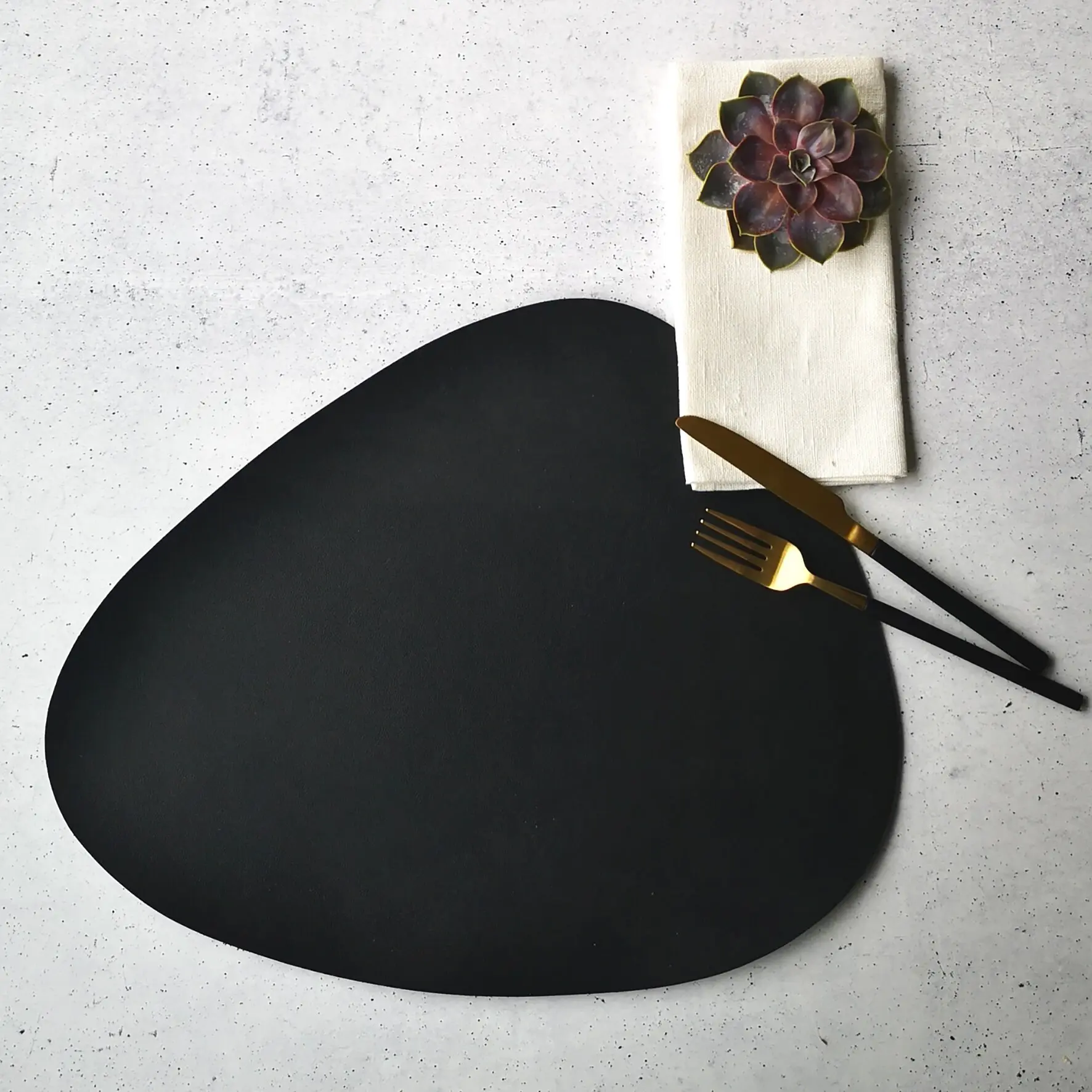 Mit seiner modernen Curve-Form schafft das schlichte Platzset einen tollen Kontrast zu Tellern und Besteck. Aus hochwertigem Kunstleder.