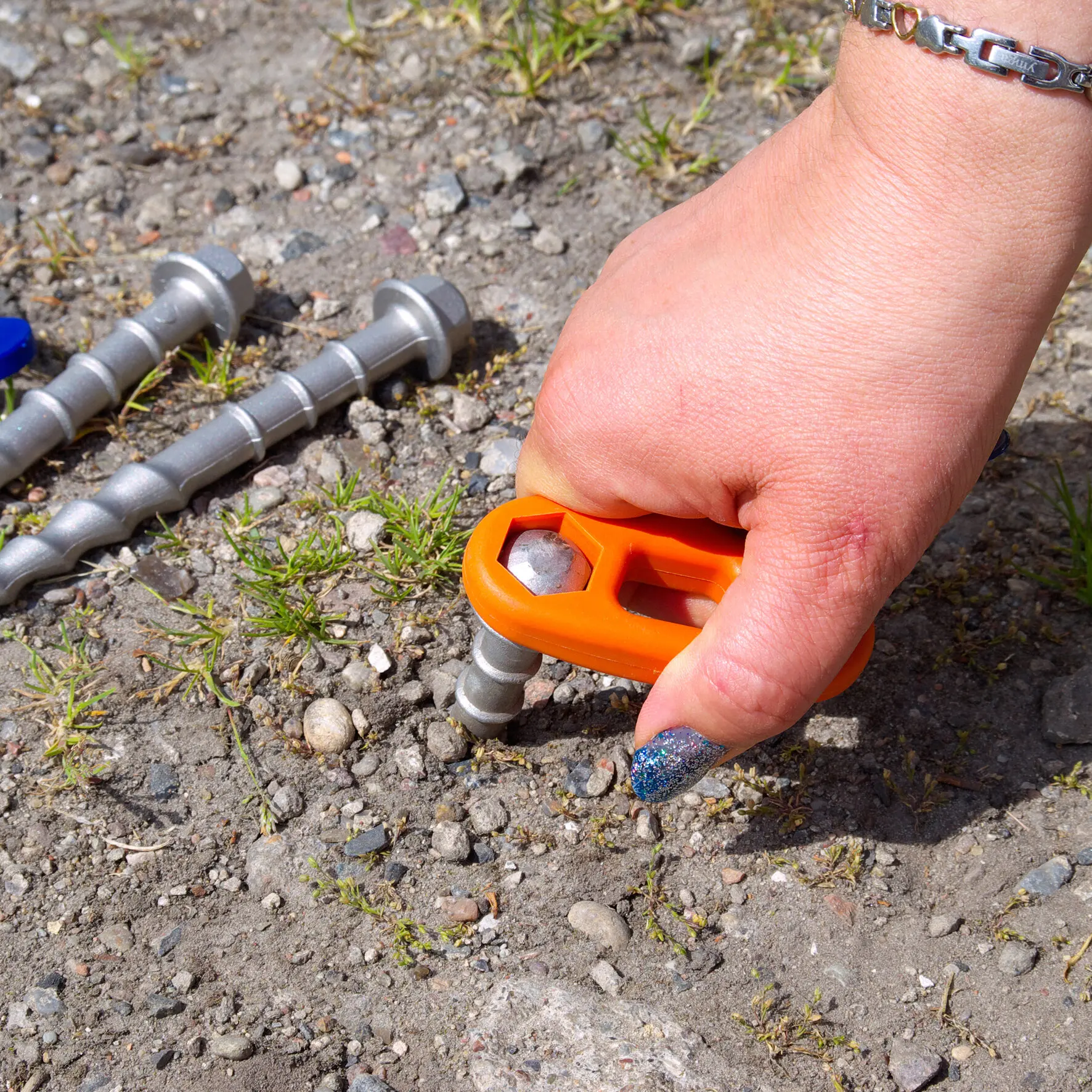 Der PP Schlag ist der einzige Schlag-Schraubhering in der PP Familie. Du schlägst ihn mit einem Hammer ein und kannst ihn mit einem Handschlüssel oder maschinell wieder ausschrauben. Er ist speziell für harte Böden entwickelt. Im Set sind 4 PP Schlag mit einer Länge von 15 cm und 4 Haken enthalten. Die Schlüsselweite beträgt 17 mm.