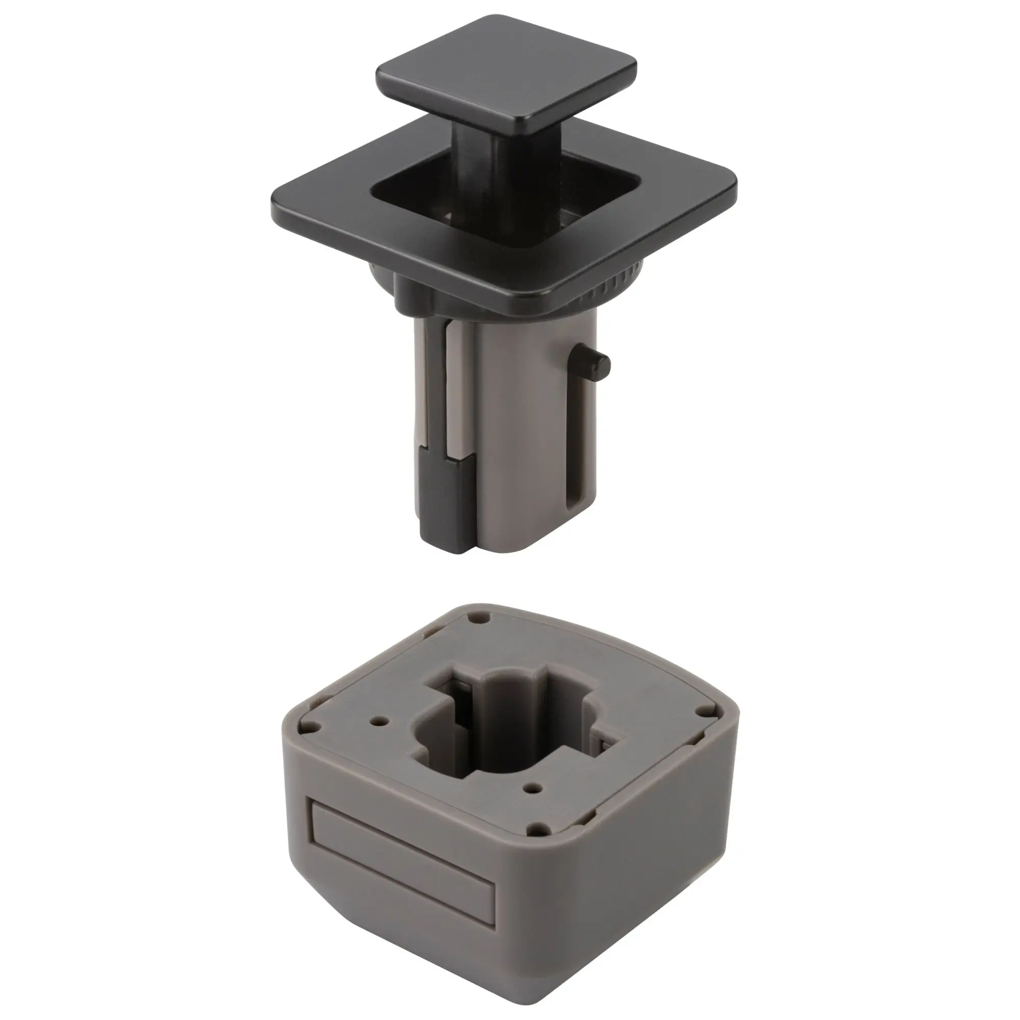 Innovatives Push-to-Open-Schließsystem mit zwei Komponenten, hoher Passgenauigkeit, einfacher Montage und platzsparendem Design. Das Schloss besteht aus Kunststoff, der Druckknopf aus Zamak (= Zink-Druckgusslegierung).