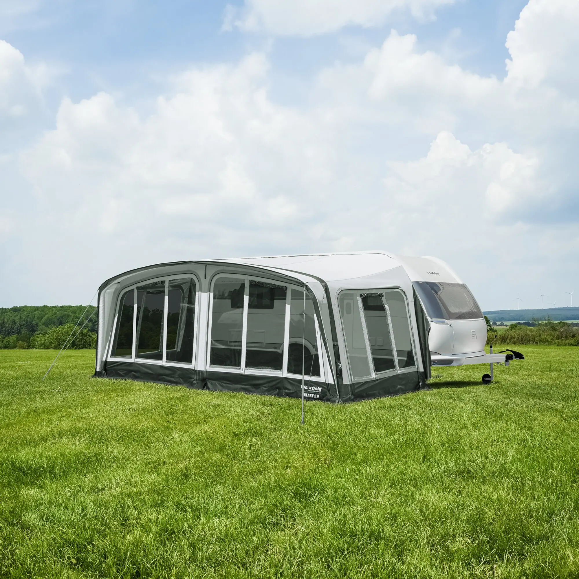 Das Luxusluftvorzelt Galaxy von Westfield TQC ist made in Germany mit den besten europäischen Stoffen. Dank des Designs und der modernen Form fühlen Sie sich im Urlaub noch wohler. Die großen, von innen verschließbaren Fenster, die Tiefe von 250 cm und die Stehhöhe im Vorzelt bieten Ihnen ein sehr angenehmes Raumgefühl. Auch das Raumklima ist dank der hochwertigen AIRTEX® und TenCate® All Season Materialien sowie der vielen Belüftungsmöglichkeiten bei jedem Wetter optimal. Mit dem Luxusluftvorzelt Galaxy, angebaut an Ihrem Wohnwagen, kann Ihr Urlaub richtig starten. Geeignet für den Saisoneinsatz.