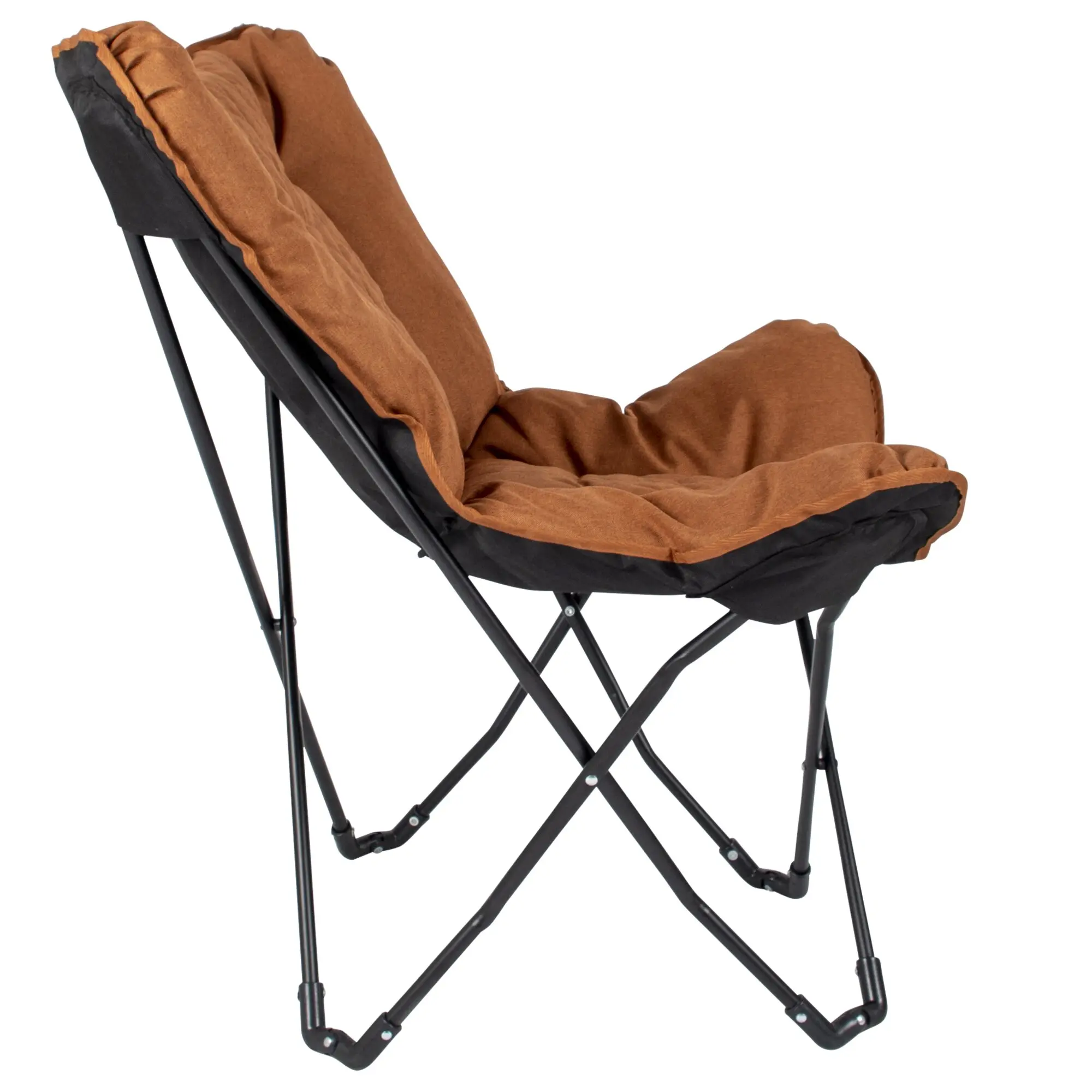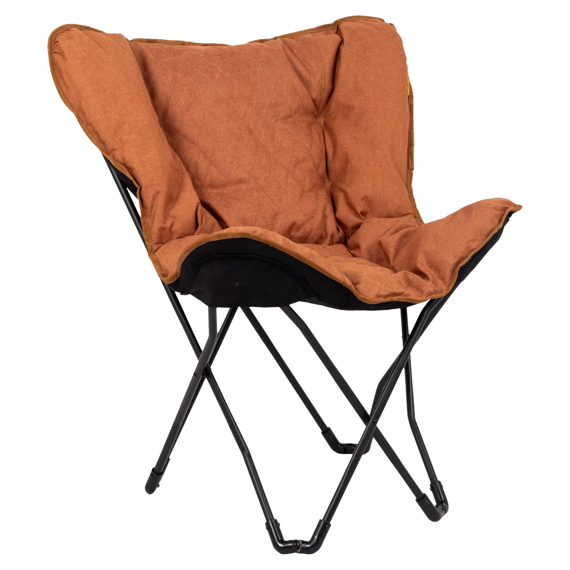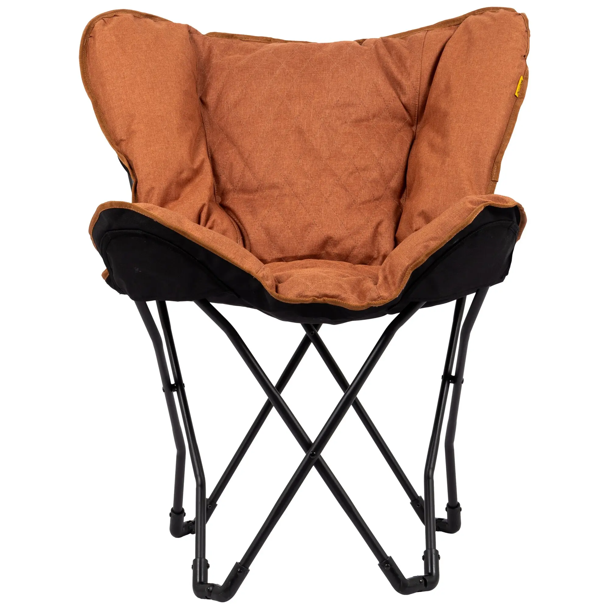 Relaxsessel mit gepolsterter kationischer Oberfläche mit genähtem Muster und breiter, tiefer Sitzfläche. Der stabile schwarze Stahlrahmen ist klappbar und der Stuhl ist dank der mitgelieferten Tragetasche leicht zu transportieren.