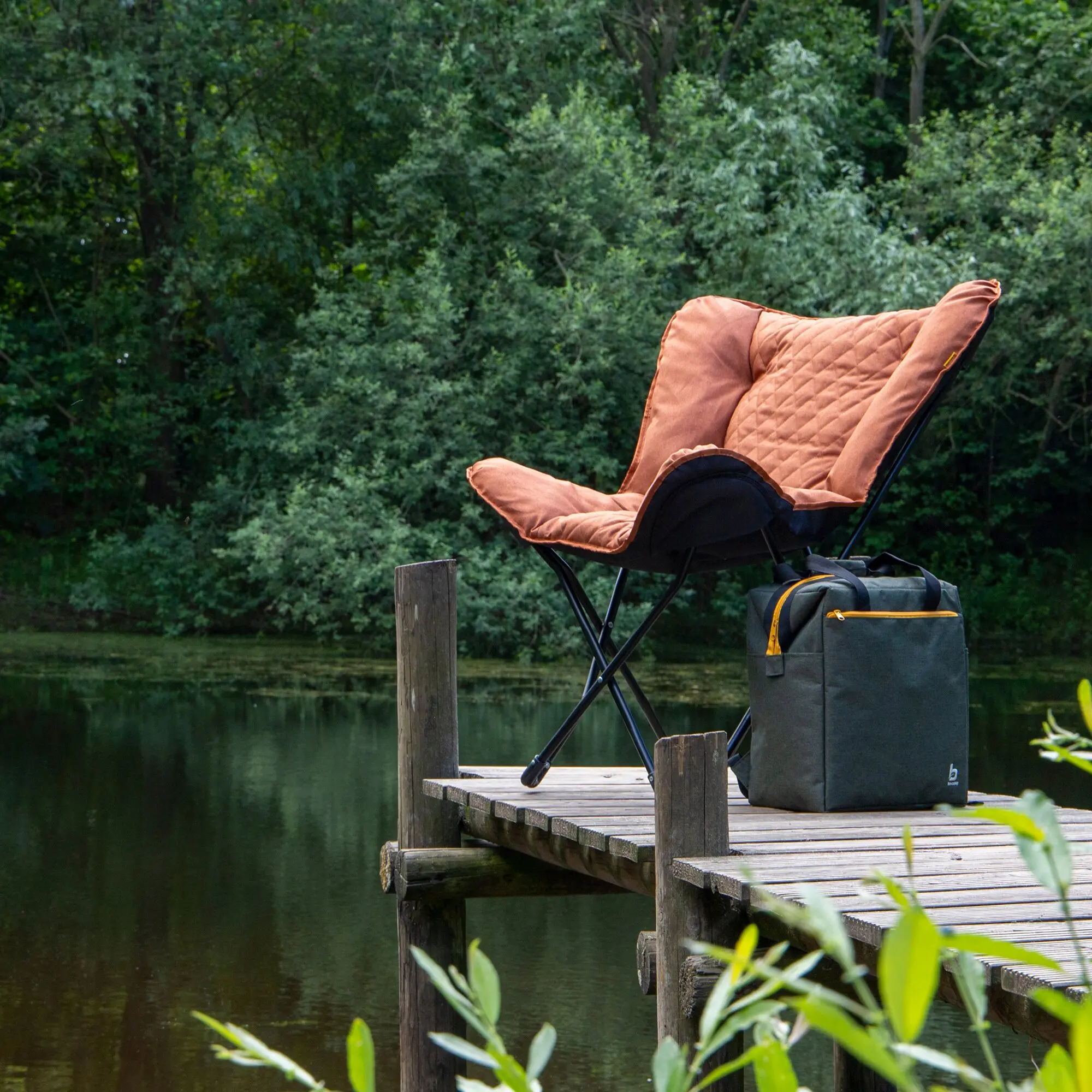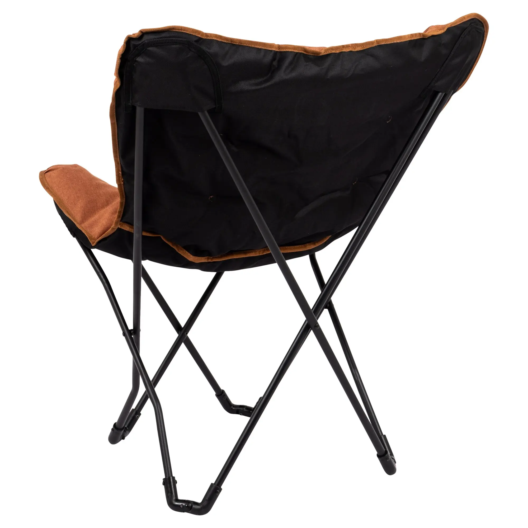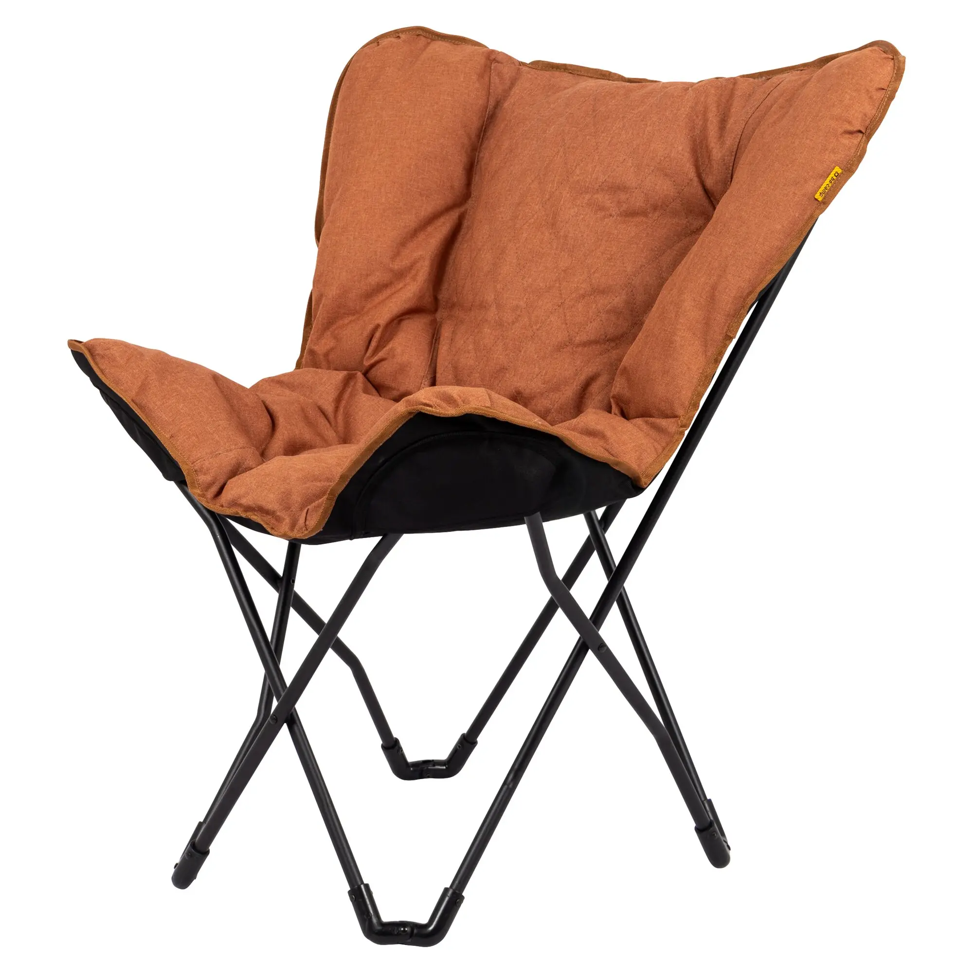 Relaxsessel mit gepolsterter kationischer Oberfläche mit genähtem Muster und breiter, tiefer Sitzfläche. Der stabile schwarze Stahlrahmen ist klappbar und der Stuhl ist dank der mitgelieferten Tragetasche leicht zu transportieren.
