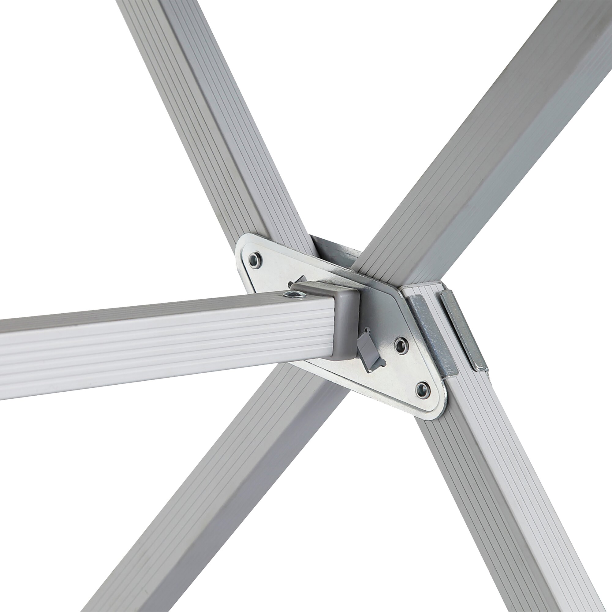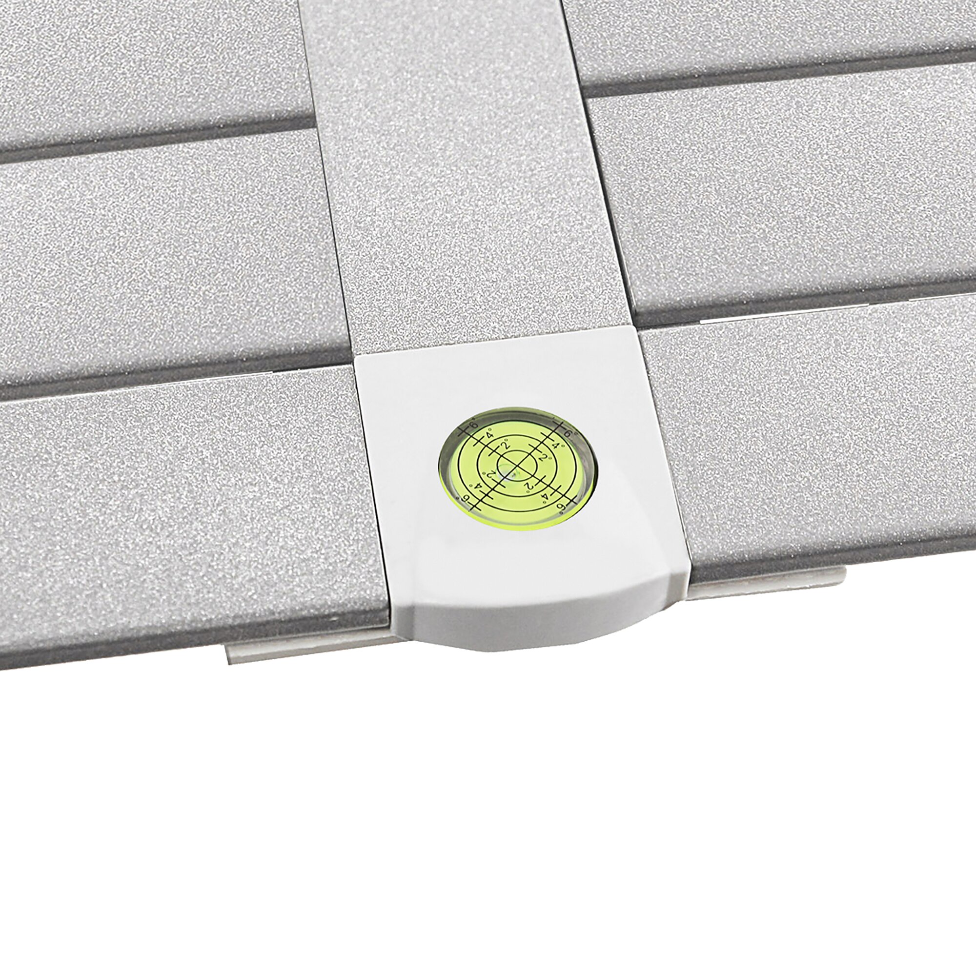 Alu-Falttisch mit rollbarer Tischplatte. Dank integrierter Wasserwaage kann auch auf unebenem Untergrund eine absolut horizontale Positionierung der Tischplatte erreicht werden (Level System). Stabiles Untergestell mit verstellbarem Standbein. Ein Packsack für den komfortablen Transport ist im Lieferumfang enthalten.
