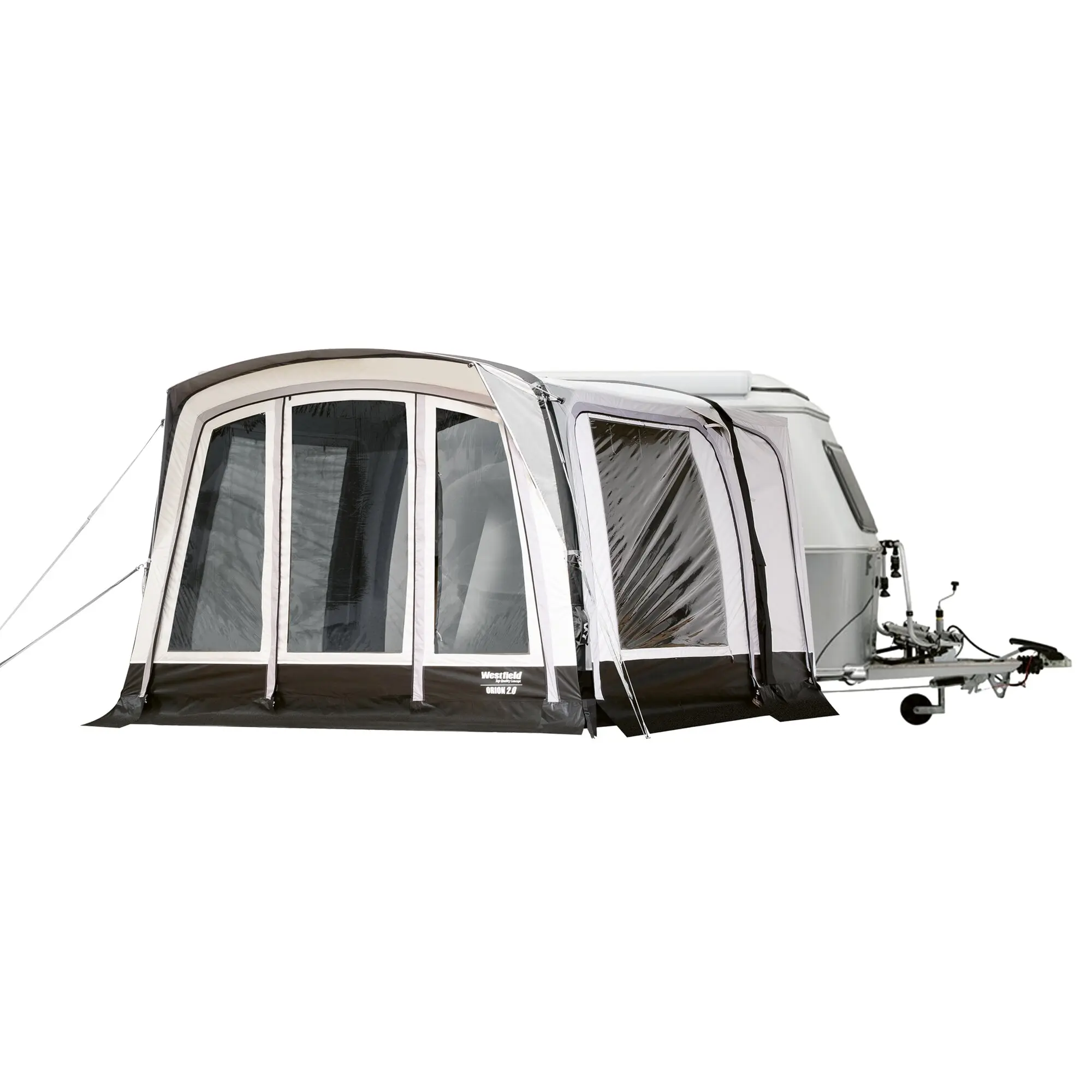 Die funktionale Schleuse verbindet das freistehende Orion Busvorzelt mit Ihrem Touring Caravan. Die Befestigung der Schleuse erfolgt am Zelt über einen Reißverschluss und am Caravan über einen Keder.