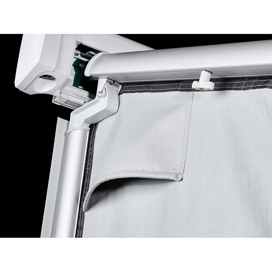 Das bewährte Schutzzelt Safari Residence setzt sich aus 2 einzelnen Seitenwänden und einer Vorderwand in neutraler Farbe (RAL 9002) zusammen. Die in den Seitenteilen eingearbeiteten Fensterfolien sind mit Moskitonetzen versehen und können vollständig geöffnet werden. Das Vorderteil hat sowohl rechts als auch links eine eingearbeitete Eingangstüre (ab Länge 3,5 m) und kann sowohl teilweise als auch vollständig aufgerollt werden. Durch die integrierte Befestigungsschiene kann die Front bequem z. B. mit einem Sun-Blocker kombiniert werden. Mittels eines Klemmprofils werden die Seitenwände fest mit dem Markisentuch verbunden. Front und Seiten werden durch ein Doppelkeder-Profil miteinander verbunden, so dass eine starke, windfeste Verbindung entsteht. Ein in der Höhe verstellbares mit einer doppelten Gummilippe versehenes Mastprofil, in das der Keder der Seitenwand eingeschoben wird, wird gegen die Fahrzeugwand gedrückt und dichtet diesen Bereich dadurch perfekt ab. Für zusätzliche Stabilität sorgt eine diagonale Stütze zwischen dem Klemm- und dem Mastprofil. Das Thule Residence G3 ist in 6 verschiedenen Höhen (siehe Tabelle) für Fahrzeuge mit geraden Seitenwänden lieferbar. Für den Fall einer dicht über der Fahrzeugtür montierten Markise der Typen 5003, 5200 und 8000 sind spezielle Seitenwände in den Höhen M und L zur Kombination mit einer höheren Vorderfront mit geringerem Dachgefälle als Sonderbestellung erhältlich. Bei allen Sonderbestellungen muss mit einer Lieferzeit von ca. 4 – 6 Wochen gerechnet werden. Lieferung erfolgt inklusive 2 Packtaschen und Wagenschürze.