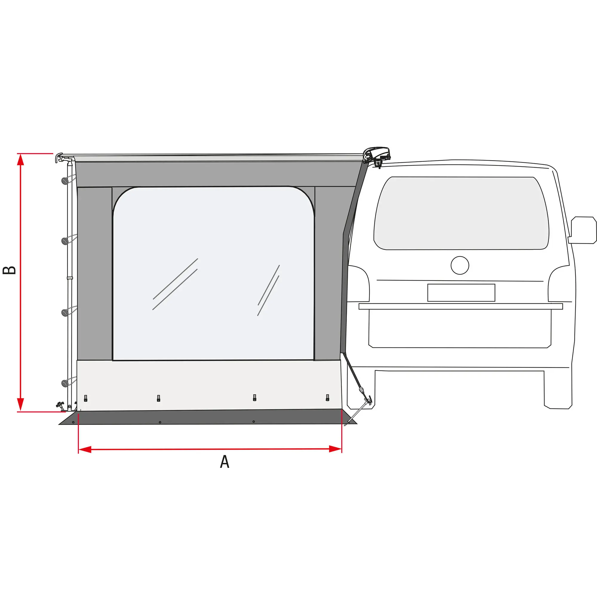 Praktische Seitenwand mit großem Fenster und Bodenverlängerung. Aus wasserabweisendem, UV-beständigem und waschbarem Vinyl. Einfache Montage durch die mitgelieferte teleskopische Spannstange und Erdnägel. Rechts und links verwendbar. Inkl. Adapter.