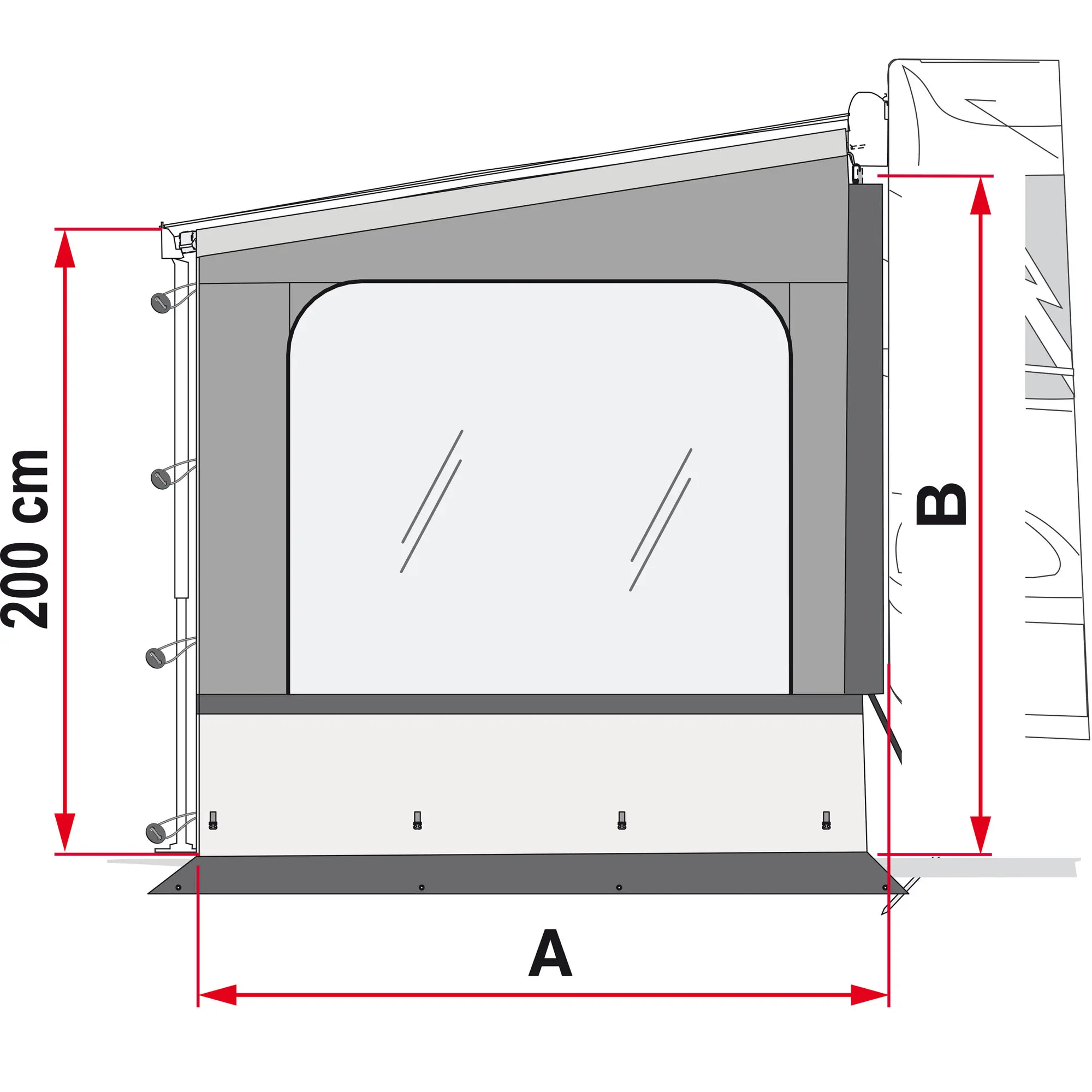 Praktische Seitenwand mit großem Fenster und Bodenverlängerung. Aus wasserabweisendem, UV-beständigem und waschbarem Vinyl. Einfache Montage durch die mitgelieferte teleskopische Spannstange und Erdnägel. Rechts und links verwendbar. Inkl. Adapter.