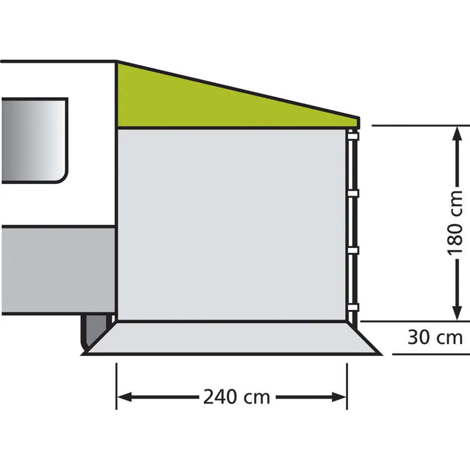 Für Sonnendächer mit einer Tiefe von 240 cm. Mittels verstellbaren Spannbändern wird die Seitenwand am Sonnendachgestänge aufgehängt und nach unten abgespannt. Die Seitenwand kann sowohl rechts als auch links verwendet werden.