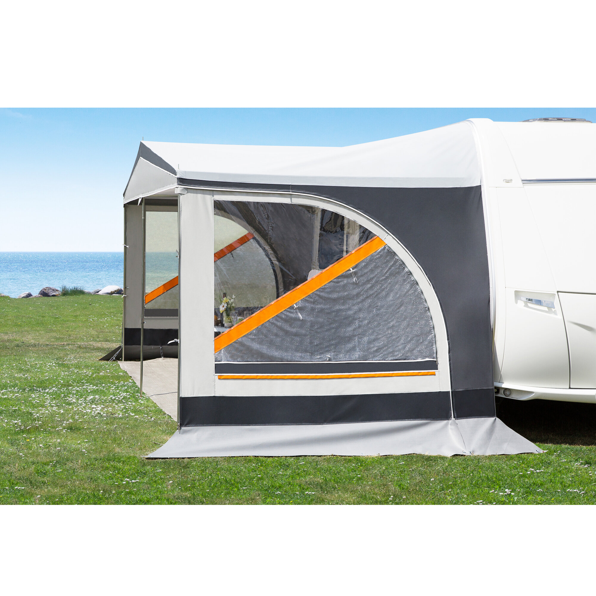 Zwei Seitenwände mit großen Folienfenstern (inkl. Gaze), zum Nachrüsten für das Sonnendach Stella. Anbringung mit Reißverschluss.