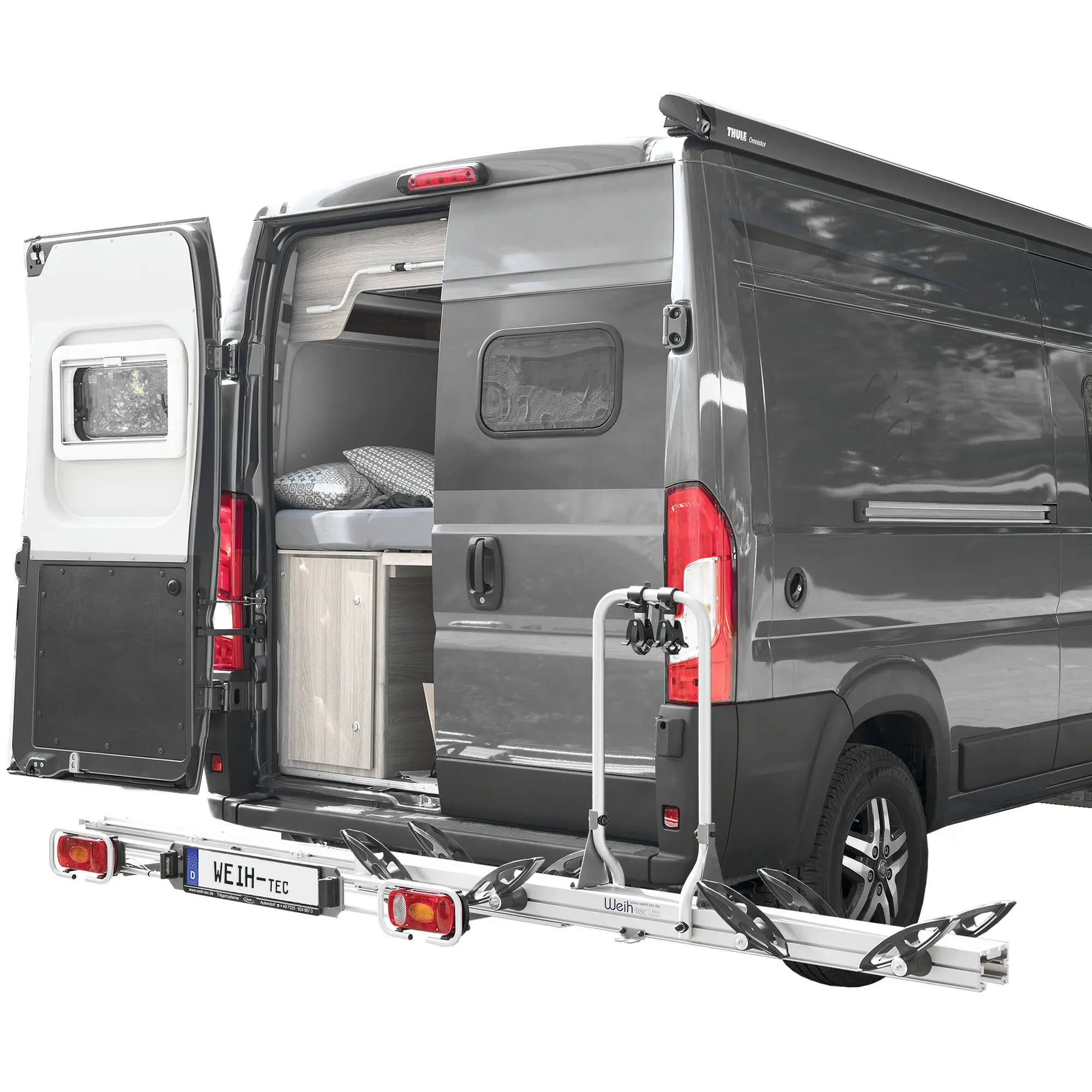 Vormontierter Träger inkl. Beleuchtung mit 13-poligem Anschlussstecker, fahrzeugspezifische Aufnahmen (13 bzw. 18 kg), Befestigungsbügel, Befestigungsmaterial für 2 Fahrräder, ECE-Gutachten.