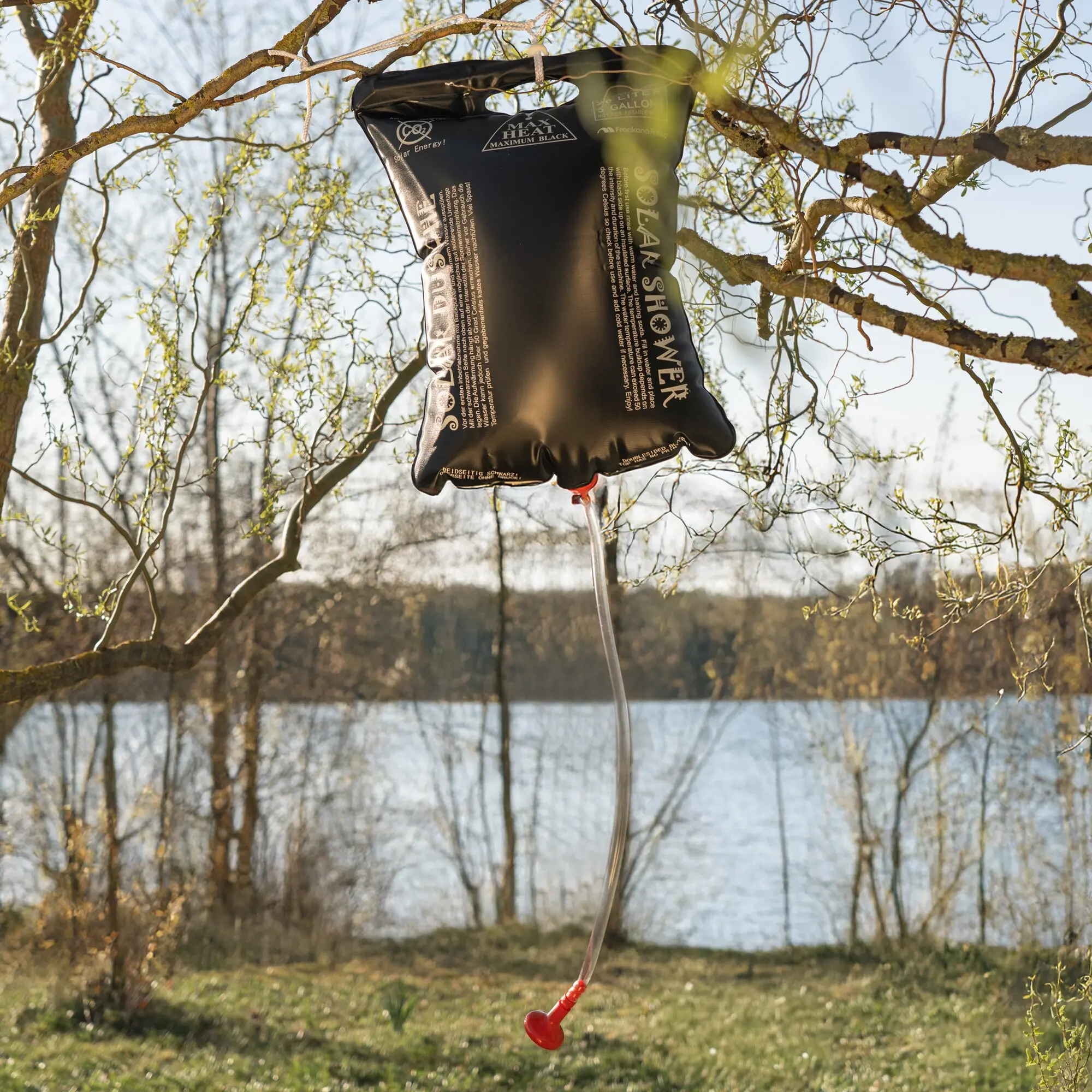 Kostenlos warmes Wasser durch umweltfreundliche Sonnenenergie. Selbst bei bewölktem Himmel erwärmt sich das Wasser im Sack (20 l) auf bis zu 40 °C. Die schwarze Rückseite (unbedruckt) sorgt für eine besonders schnelle Aufheizung. Algenbildung wird verhindert, da kein Licht in den Sack eindringen kann. Du kannst den Sack sowohl liegend als auch hängend verwenden. Zwei Absperrventile erleichtern dir die Handhabung: eines am Sack für sicheren Transport und eines am Duschkopf für bequeme Nutzung. Phthalatfrei.