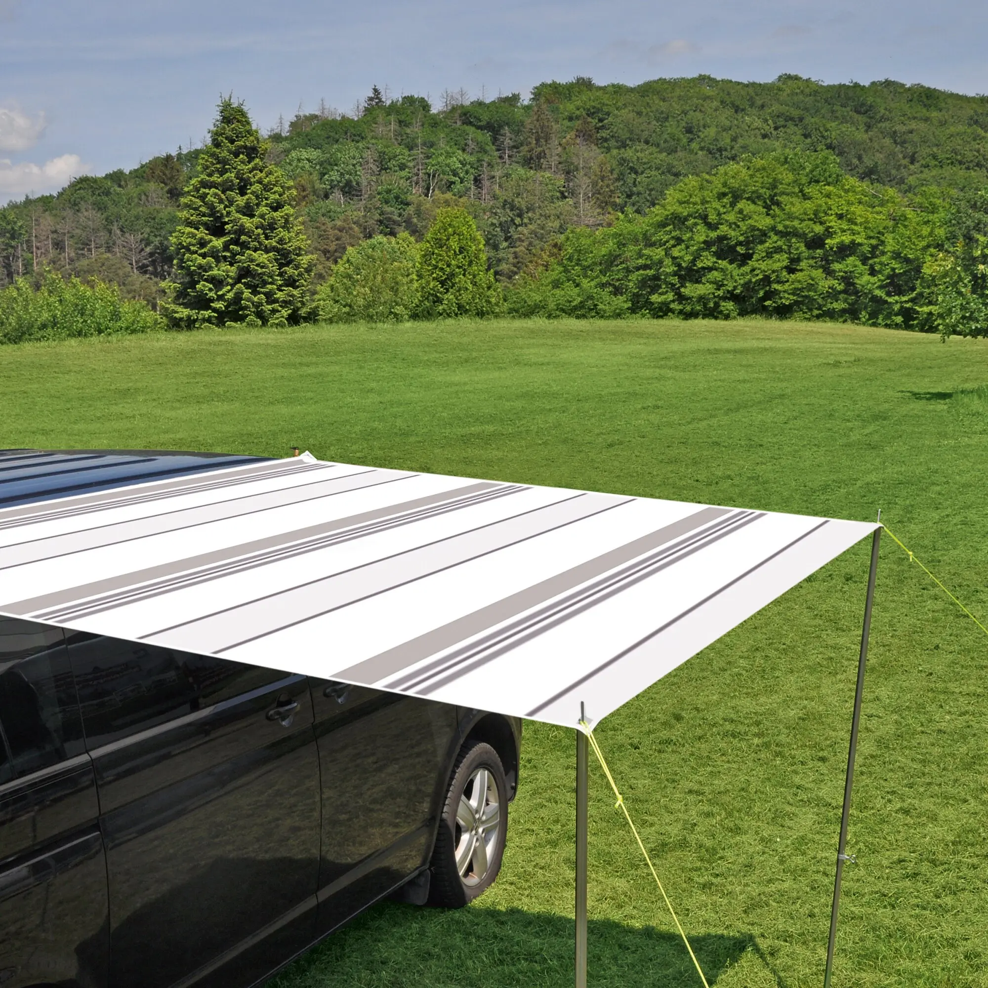 Das Sonnendach Elba ist das ideale Zubehör für Ihren Van! Mit seinem modernen Streifendesign in Grau/Anthrazit vereint es Funktionalität und Stil und bietet schnellen Schutz vor der Sonne. Sie können zwischen zwei Befestigungsoptionen wählen: der Keder-Befestigung für die Kederschiene und dem Schleusenstab für die Regenrinne.