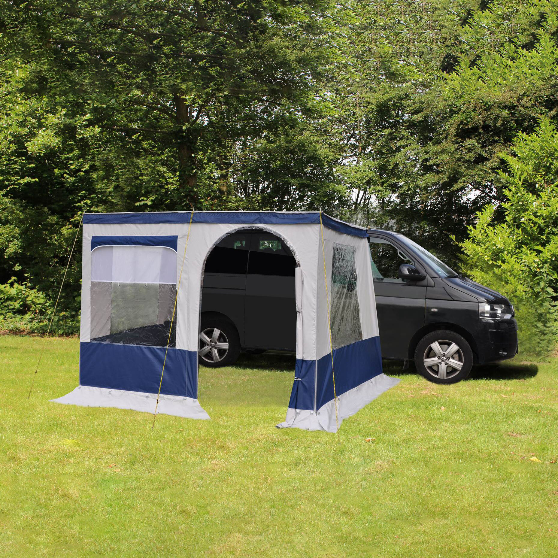 Mit diesem Erweiterungsset kann man aus dem Sonnensegel Fjord ein Vorzelt zaubern. Einfach die Seiten- und Vorderwand mit dem Klettband an der Innenseite des Sonnendachs montieren. Die Seitenwände und Vorderwand werden mit einem Reißverschluss verbunden. Somit entsteht ein komplett geschlossenes Vorzelt und Sie sind vor Wind und Regen geschützt. Die Seitenwände haben Klarsichtfenster, die Vorderwand zusätzlich noch eine Eingangstür. Inklusive Stangenset. Material: All Weather Tex.