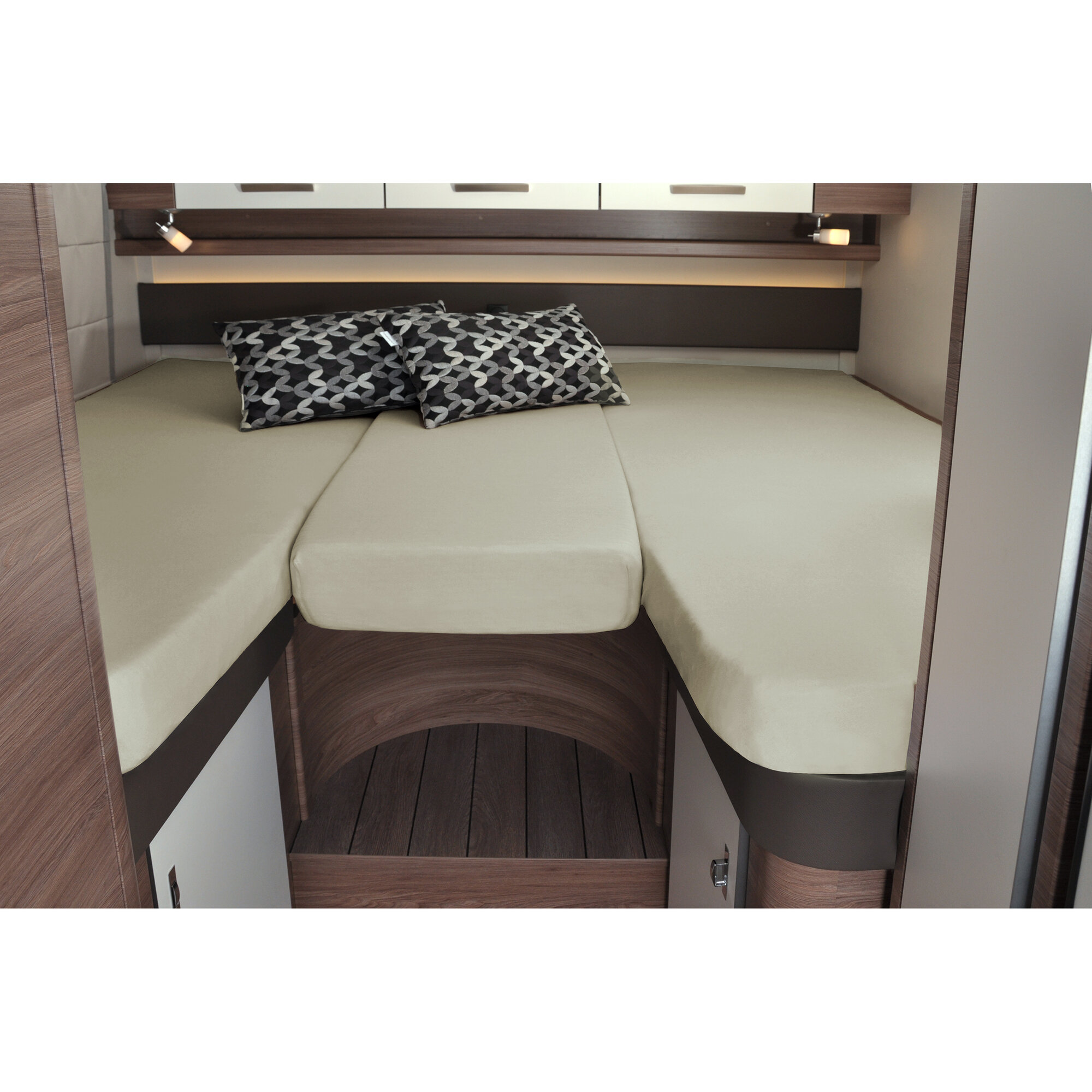 Das Problem ist bekannt – die Betten in Wohnmobilen oder Wohnwagen haben oft den räumlichen Verhältnissen angepasste Sonderformen bei den Matratzen, weshalb herkömmliche Spannbettlaken nicht oder zumindest nicht zufriedenstellend verwendet werden können. Abhilfe schaffen unsere neuen Spannbettlaken in den entsprechenden Sonderformen mit Schräg-ecke für französische Betten oder als 3-teiliges Set für Längsbetten im Wohnwagen oder Reisemobil. Dank der Form und des dehnbaren Materials – 97 % Baumwolle mit 3 % Elastan – ergibt sich immer eine ideale Passform. Das Jersey-Gewebe ist sehr hautfreundlich und man liegt sehr angenehm auf dem feinen Stoff, der in 4 Farben erhältlich ist.