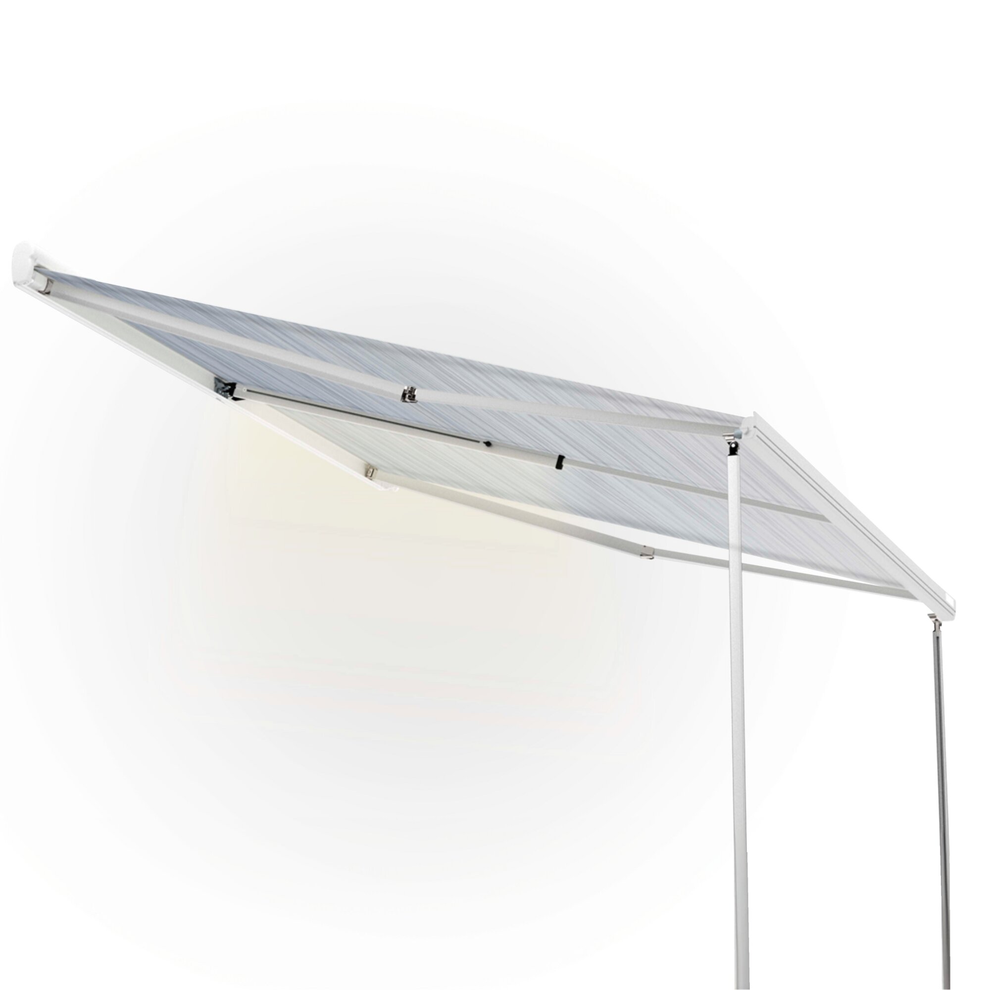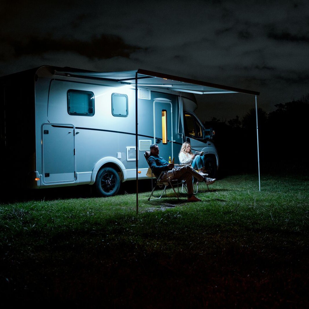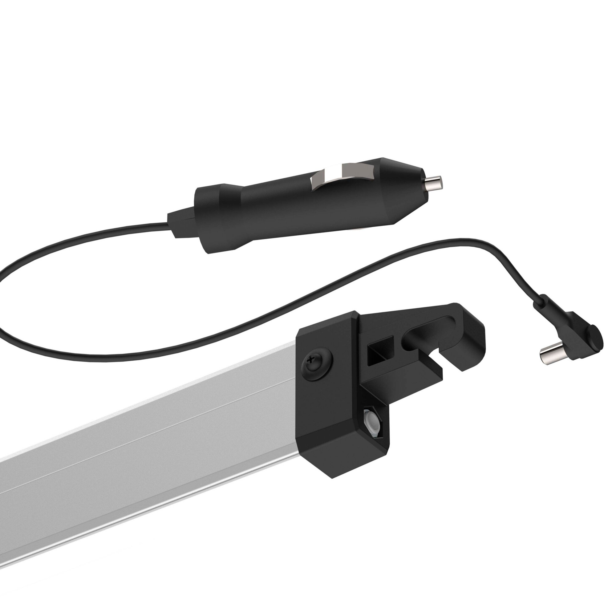 Spannstange mit integrierter LED-Beleuchtung (COB*) und Stromversorgung über Klinke und Zigarettenanzünder (12-V-Steckdose). Gleichmäßiges, neutrales Licht (4000 K) dank PVC-Diffusor.