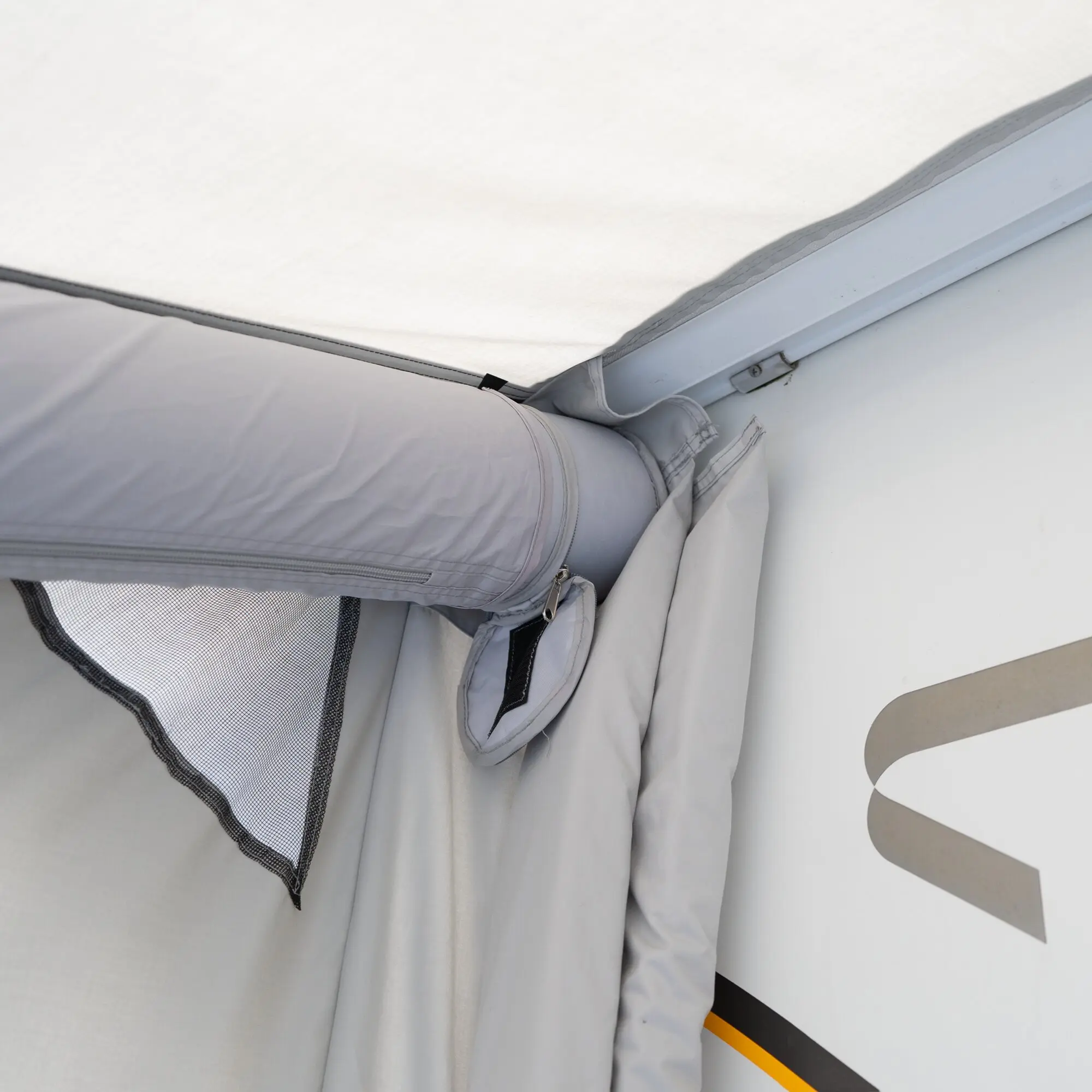 | Lieferumfang Zelte: | 2 Andruckstangen, 2 Packtaschen, Abspannmaterial, Airtube, Bodenschürze, Luftpumpe, Radkastenblende, Zelt |
