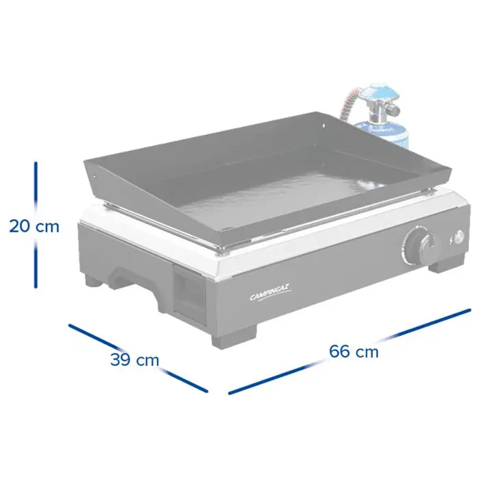 Ideal für Balkon, Terrasse oder Camping: Der Tischgrill Plancha Othello 1 CV ist vormontiert und sofort einsatzbereit. Er wird mit einer handlichen Gaskartusche betrieben – ideal für flexible Grillmomente unterwegs. Der kraftvolle Blue-Flame-Brenner aus Edelstahl sorgt für gleichmäßige Hitze über die gesamte Grillfläche. Die emaillierte Guss-Planchaplatte (30 × 45 cm) ist langlebig und bietet viel Platz. Durch das Abflussloch gelangen Reste direkt in den Fettauffangbecher, was die Reinigung besonders einfach macht.