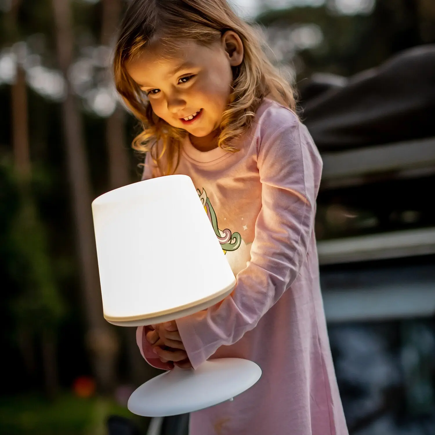 Licht zum Mitnehmen. Diese Leuchte begleitet uns überallhin, wo flexibles Licht benötigt wird. Die integrierte Powerbank (2,6 Ah, 3,7 V) liefert bis zu 14 Stunden Licht und wird über ein USB-Kabel aufgeladen. Ideal also für alle Orte ohne Stromanschluss, wie im Garten, auf dem Balkon oder beim Glamping. Auch das Mobiltelefon kann im Notfall hier kurzzeitig Strom tanken. Das Licht ist in drei Stufen dimmbar – als stimmungsvolle Beleuchtung für romantische Sommerabende, als kleine Leselampe oder sanftes Nachtlicht im Kinderzimmer.