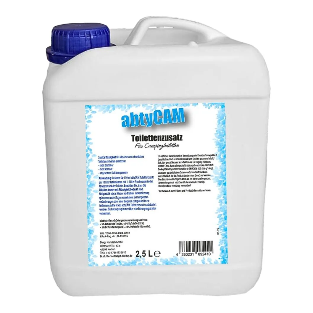 Der abtyCAM Toilettenzusatz ist ein Fäkalien-Zersetzer für chemische Toiletten und bestens für den Einsatz ohne festen Wasseranschluss geeignet. Das Produkt hat einen angenehmen Zitrusduft, der auch bei höheren Temperaturen über 35 °C hält. Zusätzlich kann abtyCAM Toilettenzusatz in den WC-Spülwassertank gegeben werden und beugt so der Verschleimung im WC-Spülwassertank vor. Gleichzeitig wird auch hier ein angenehmer Zitrusduft versprüht.