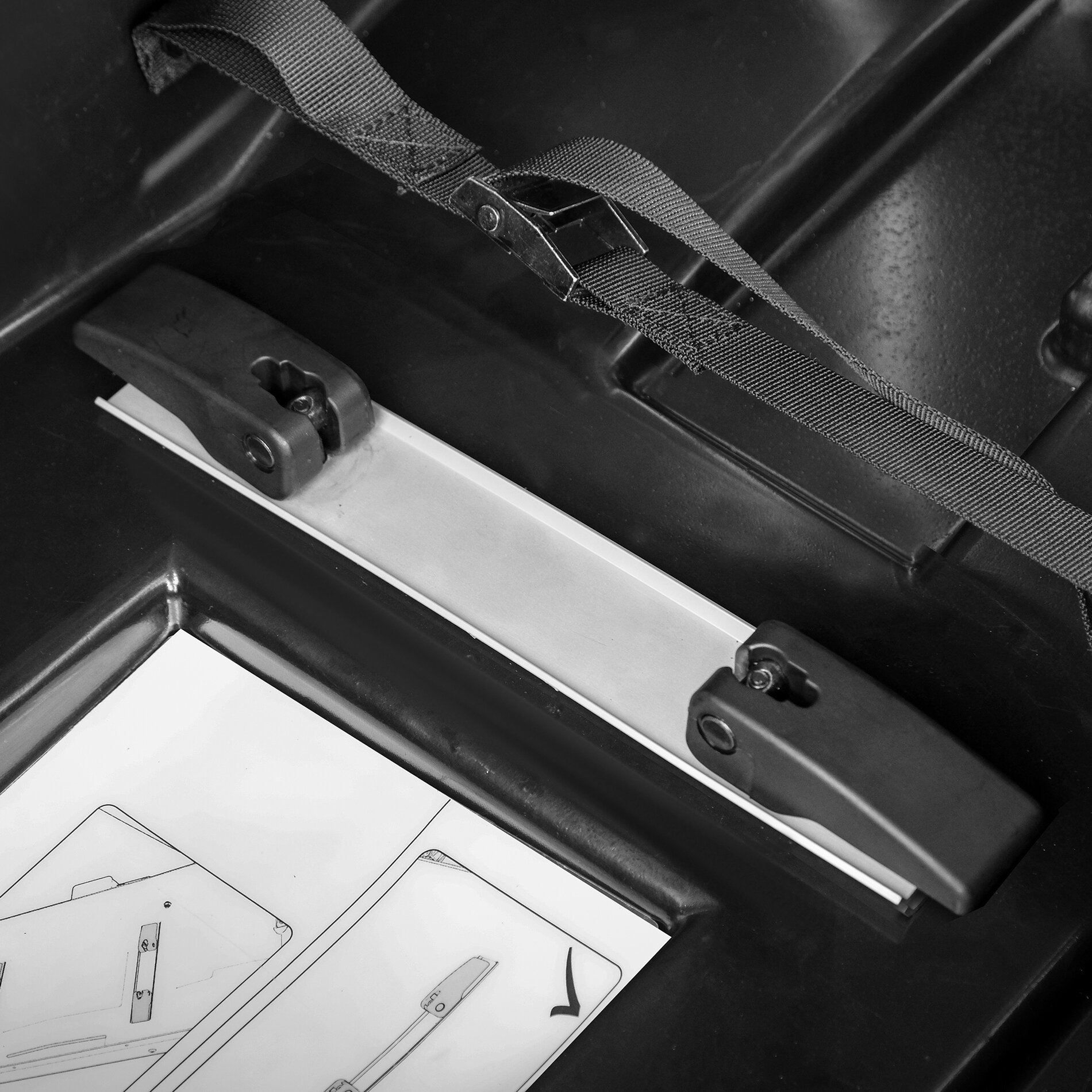 Ultraleichte Transportbox (350 l) mit einer max. Nutzlast von 50 kg. Ideal für Isomatten, Schlafsäcke, Zubehör für Ski und Snowboard. Wird auf den Schienen der SD260 und der TECDC1 Reihe mit Schnellverschlüssen befestigt, keine Vorbereitung am Träger nötig. Boden und Deckel bestehen aus robusten Hartschalen, die Seitenwände aus weichem, strapazierfähigem, wasserfestem Oxford-Textilgewebe. Zusammenklappbar. Inkl. Montagematerial.