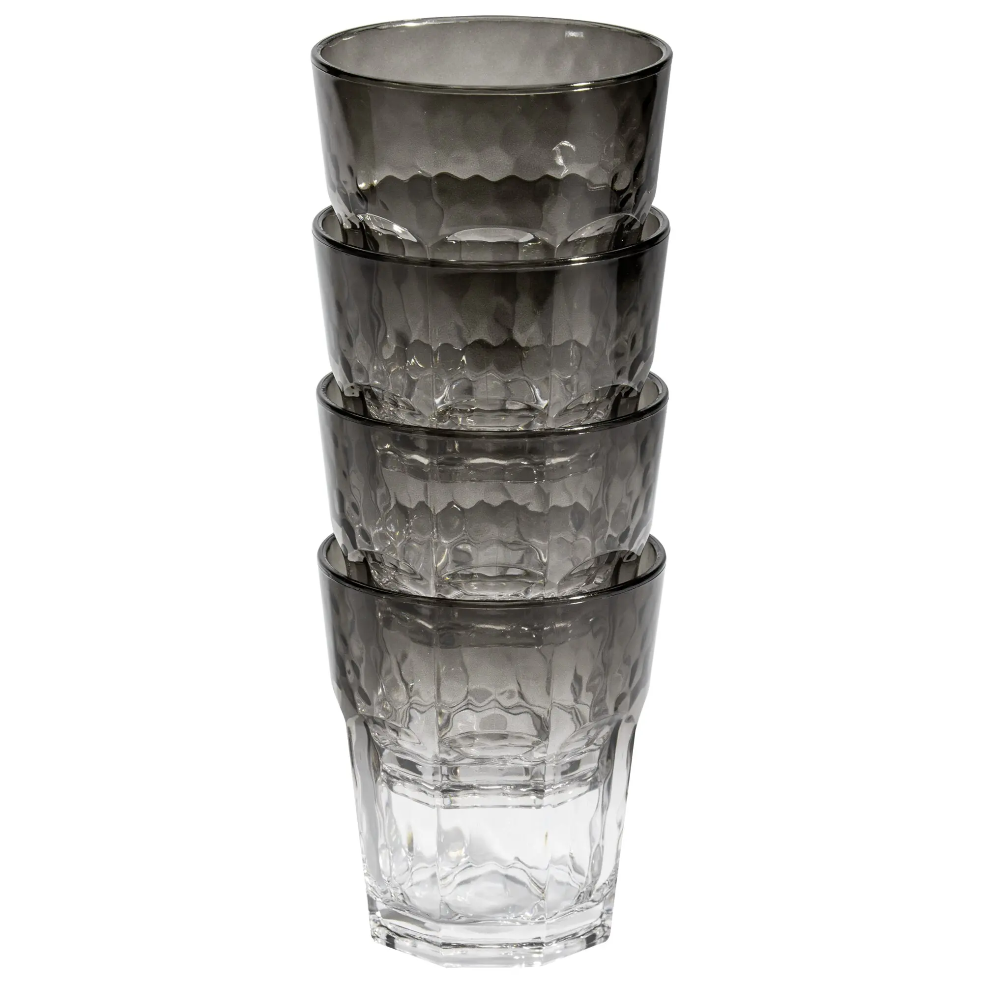 Dieses elegante Set enthält vier stilvolle Limonadengläser aus stabilem Kunststoff mit Raucheffekt. Sie sind kratzfest und leicht und damit perfekt für den Campingurlaub, Picknicks oder Gartenpartys. Außerdem sind die Gläser spülmaschinenfest und BPA-frei.