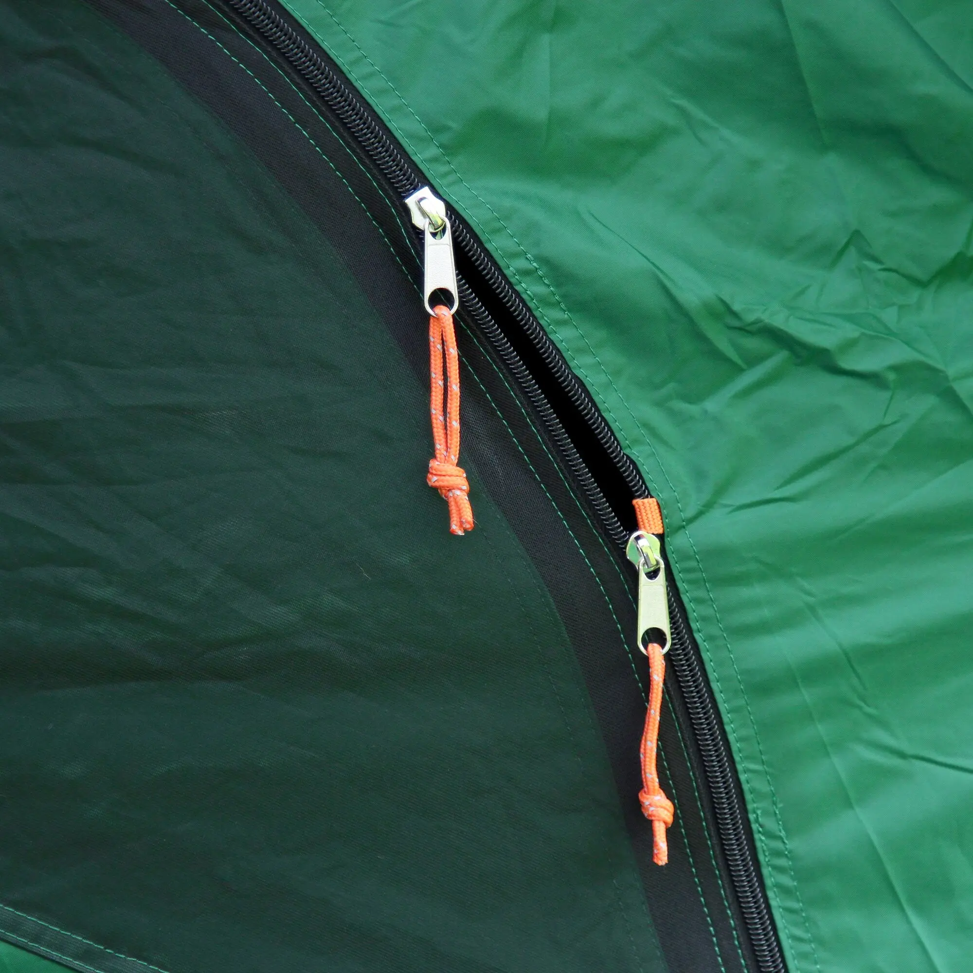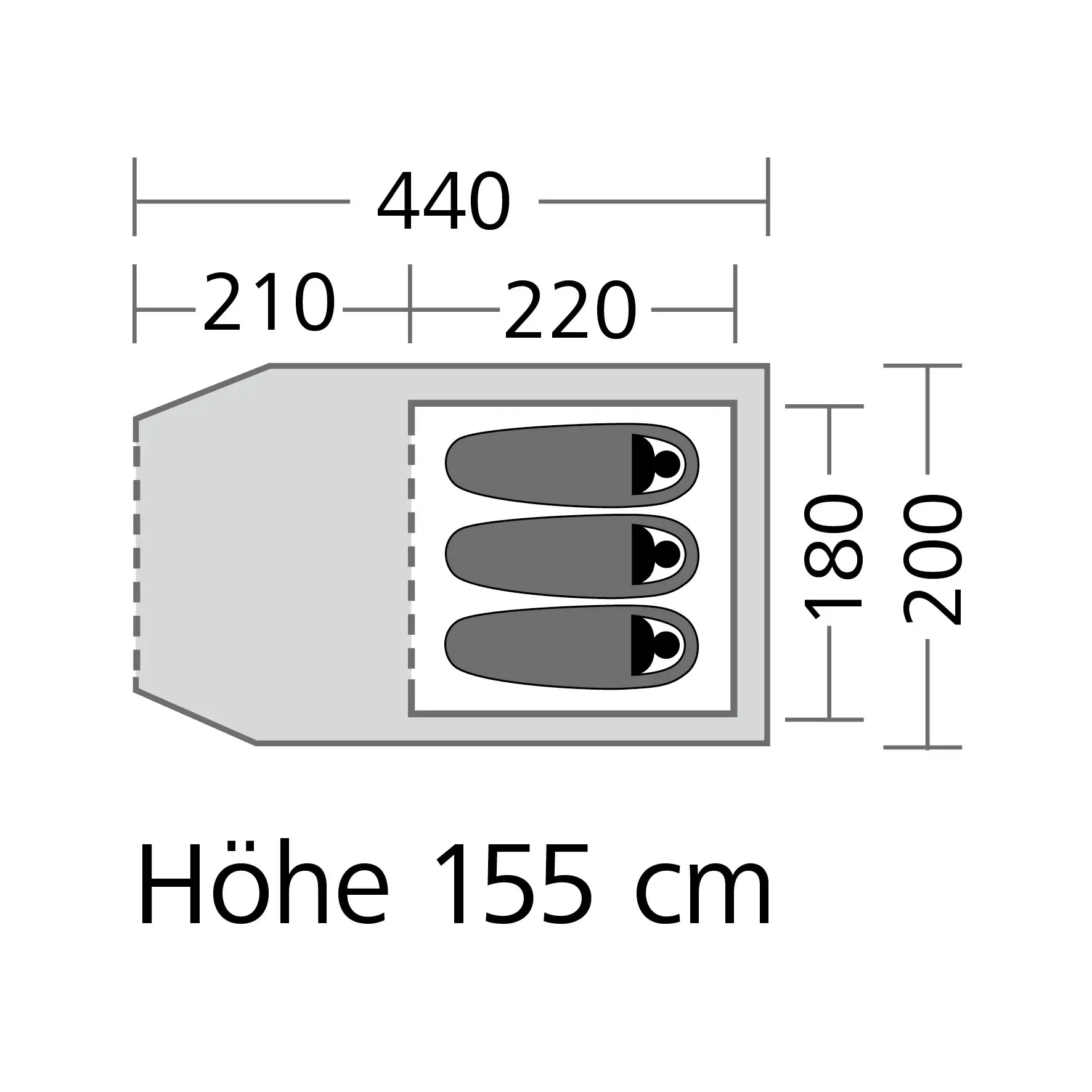 Material: Außenzelt: Polyester (PU-beschichtet und feuerhemmend); Innenzelt: Polyester (PU-beschichtet und atmungsaktiv), abgeklebte Nähte und Moskitonetz; Boden: Polyethylen.