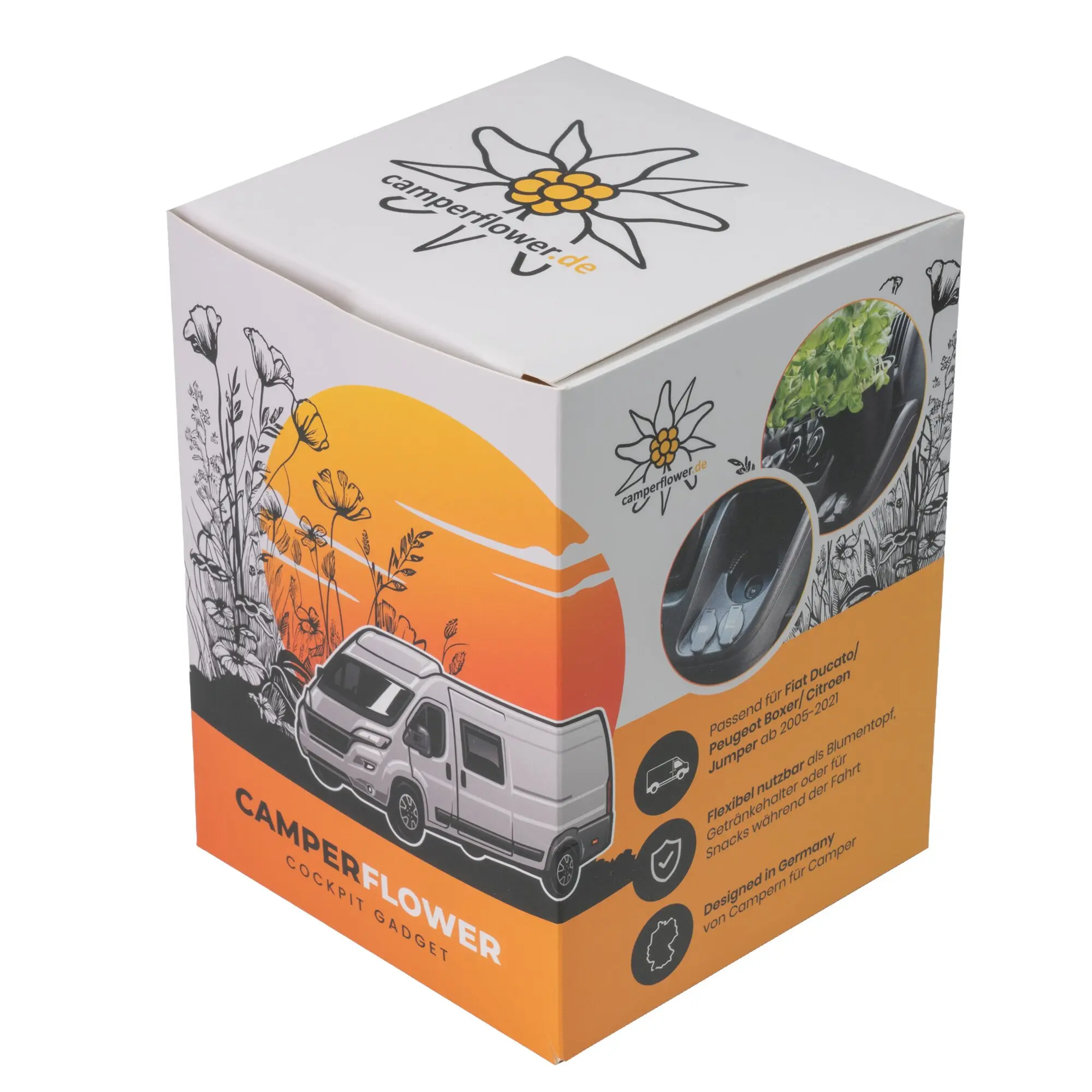 Die Camperflower Vase ist eine Maßanfertigung für das Camper Cockpit auf Basis Fiat Ducato/Peugeot Boxer und Citroën Jumper. Mit der Vase kann eine Pflanze sicher auf Reisen transportiert werden. Keine Staunässe, keine Erde im Camper – dafür immer frische Kräuter oder die Lieblingspflanze auf der Camperfahrt dabei!