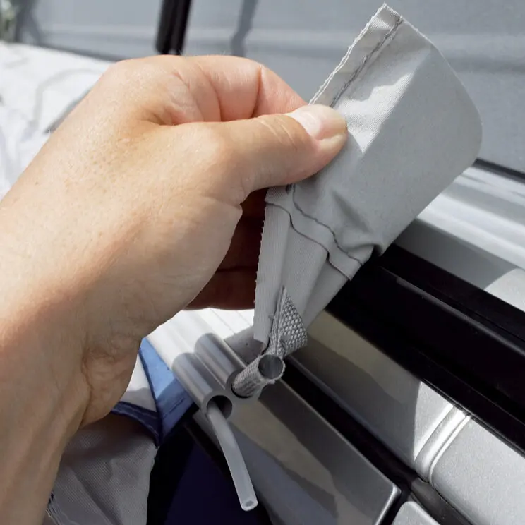 Verbindungskeder grau. Vorzeltbefestigung am Fahrzeug. Aus Vollkunststoff. Wird auf der einen Seite in die Regenrinne eingehängt, auf der anderen Seite wird der Profilkeder des Sonnensegels oder des Zeltes eingezogen.