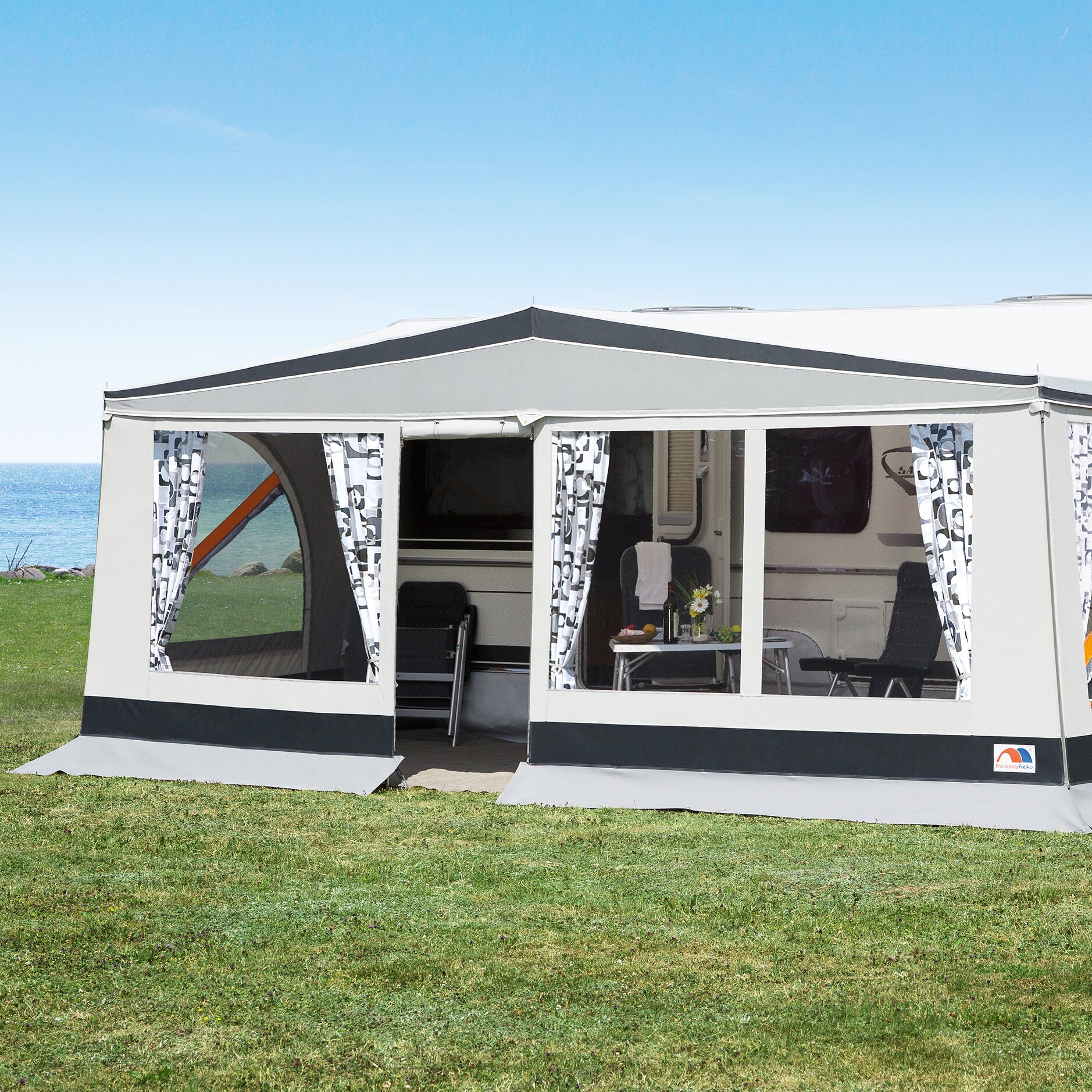 Die zweiteilige Vorderwand wird mittels Reißverschluss an Dach und Seitenwänden befestigt. Diese Erweiterung ist nur mit einem Basisgestänge empfehlenswert. Gardinen sind nicht im Lieferumfang enthalten.